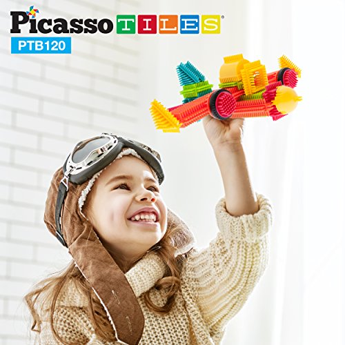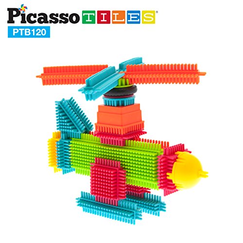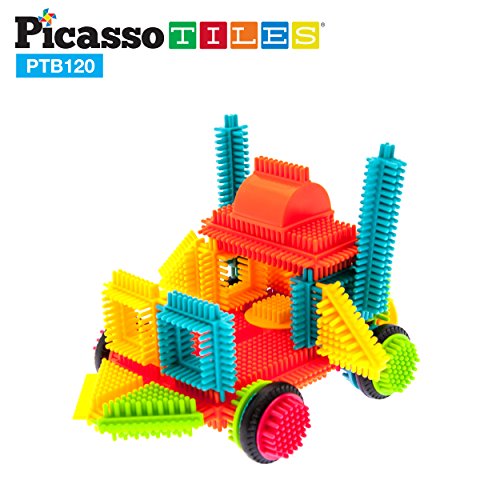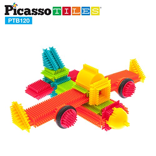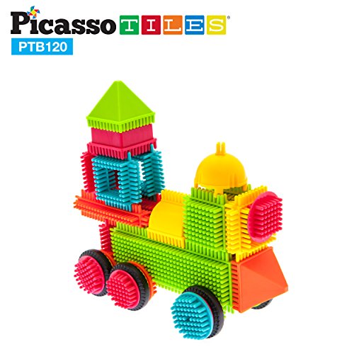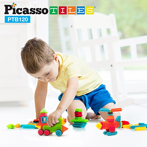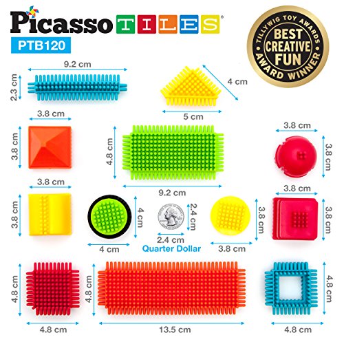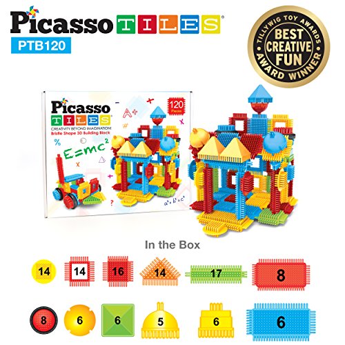 Picasso Tiles PTB120 Bristle Shape Blocks 120-Piece Basic Building Set DREAM BIG & BUILD BIG - No limitations, scalable to build as big as desired by adding more pieces to create the master piece. Picasso Tiles in colossal styles. LEARNING BY PLAYING -Never too early to start developing kids creativity. Children can acquire strong sense of color, geometrical shapes including 3D forms numbers counts & architectural design at early age. BONDING BY PLAYING -Entertaining for single or multiple parties and feel the sense of achievement together. Suitable for all ages (3 and up) by one party of in groups a great way to spend quality time with the family and love ones. LEARNING IS FUN -Encourage creativity which is the key factor to success in today's ever-changing environments. Fun and entertaining, perfect educational presents for school age children that will never go out of style. CREATIVITY BEYOND IMAGINATION -3D Bristle Shape Building Blocks for preschool, pretend play and more. Easy to construct and easy to put away for storage. In The Box -120 x 3D Bristle Shape BlocksFeature