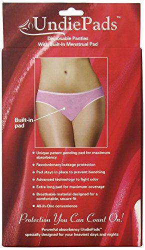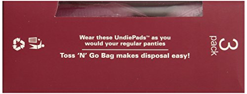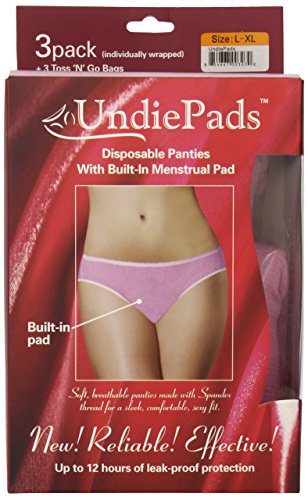 Studio : IlaNic Sanitary Products Publisher : IlaNic Sanitary Products Binding : Health and Beauty Product Description Disposable Period Panties with a unique built-in menstrual pad (3ct) and 3 Toss 'n' Go disposal bags. The First and Only leak-proof, worry-free period underwear. Up to 12 hour protection day or night. Soft, breathable fabric, made with special Spandex thread for maximum comfort and secure fit. Attractive style and soft elastic looks and feels like regular panties. Never ruin another pair of your panties again. UndiePads provide ultimate menstrual protection and are extremely convenient. Unlike other period panties that require washing after each use, these you just wear and toss away, it’s that easy! Available in size S, M and L/XL 0