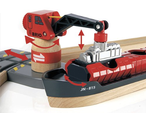 -. Feature : 16 piece set with Container ship with hinged cargo bays, motorized train, mechanical draw bridge and pivoting crane, 8 track sections and cargo / Button-activated, motorized train engine (1 AA battery not included) / Pivoting, magnetic, multi-function crane to load and unload / Moveable drawbridge with safety gates / For ages 3+