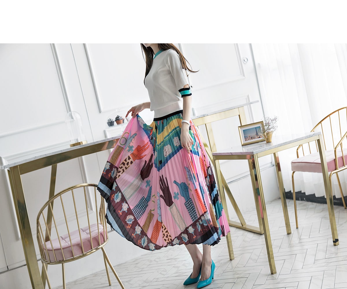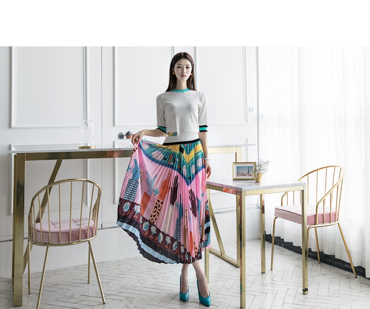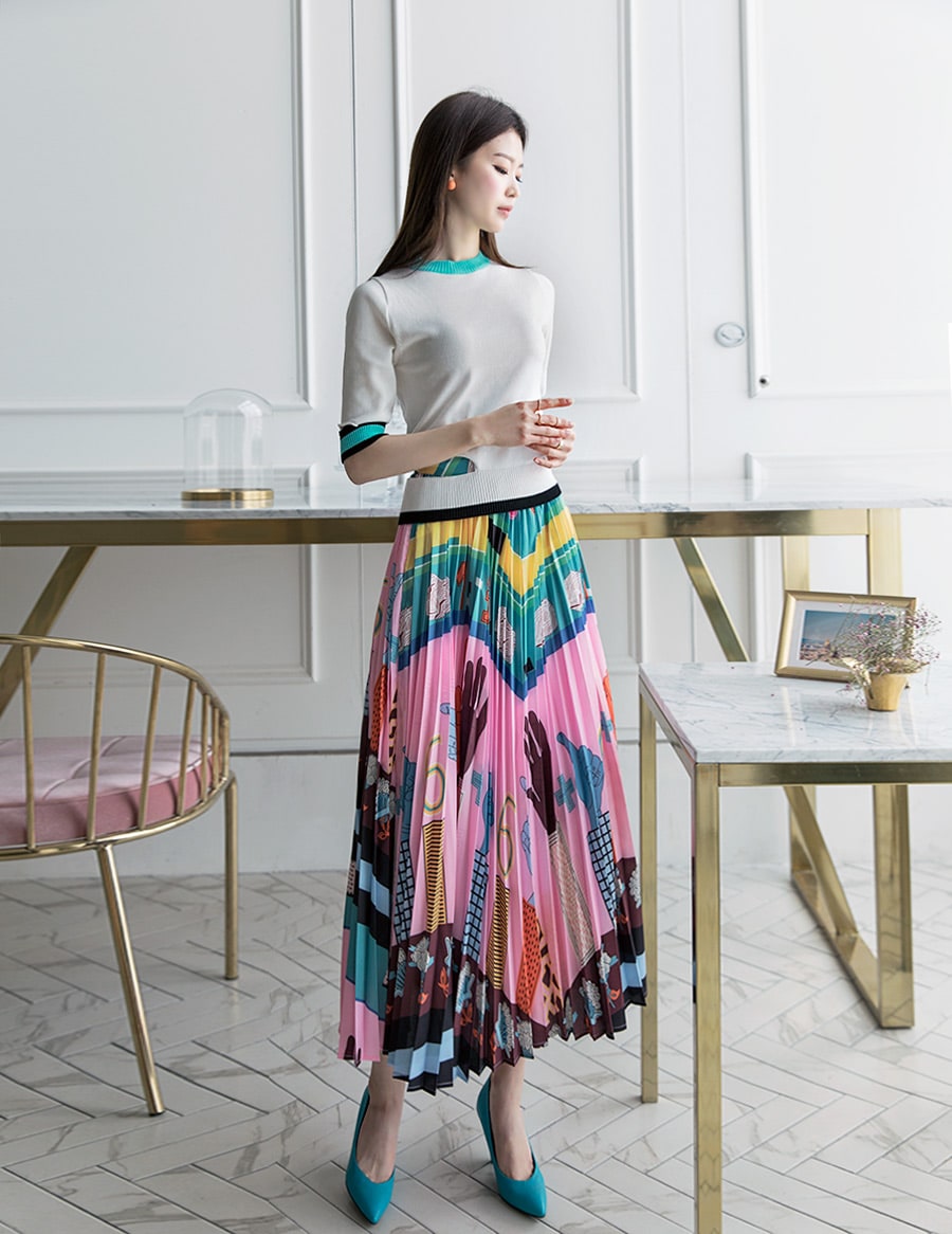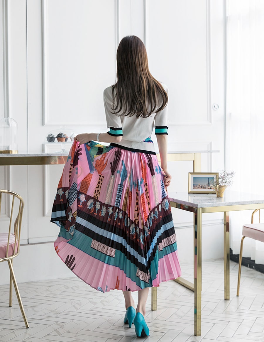 SK1666 일러스트 플리츠 롱 스커트 Pink mix