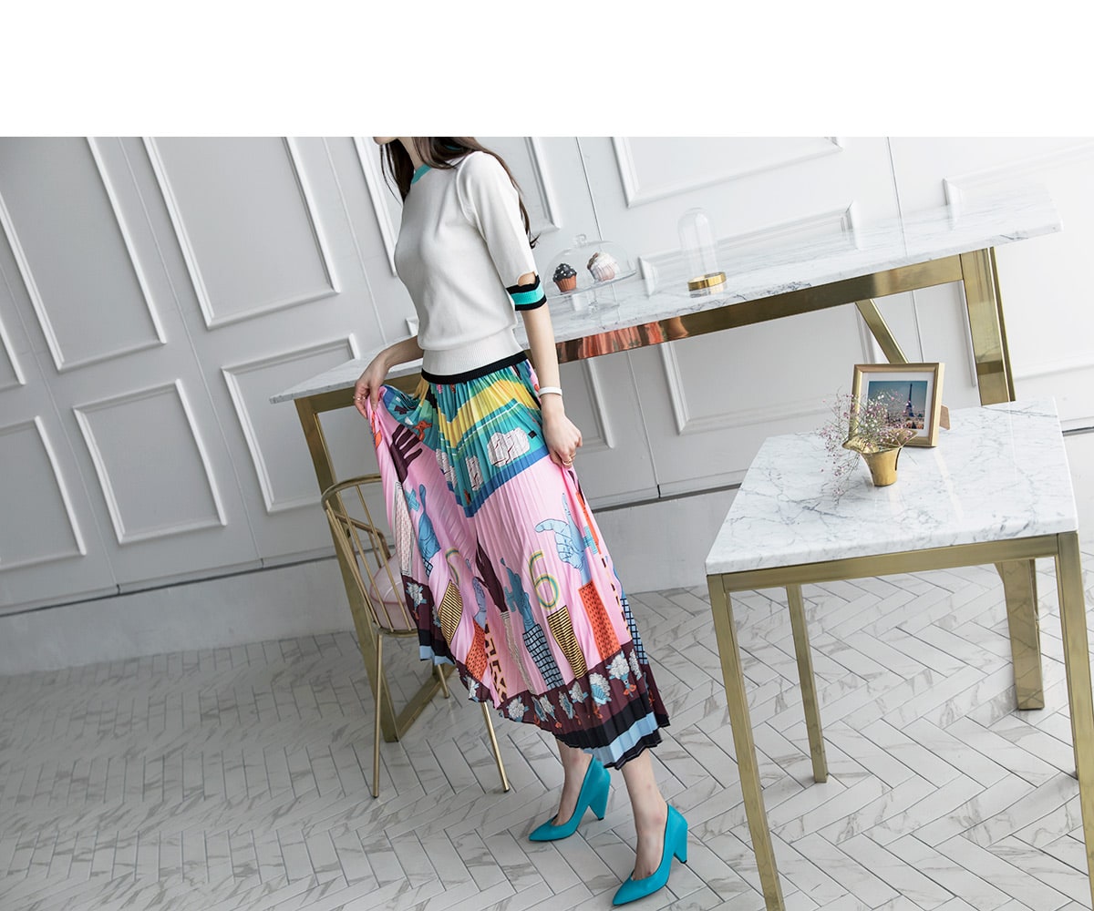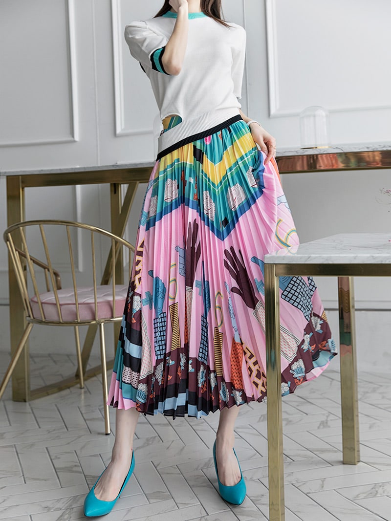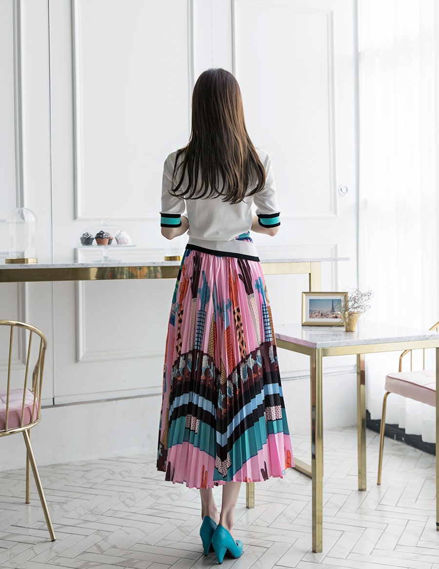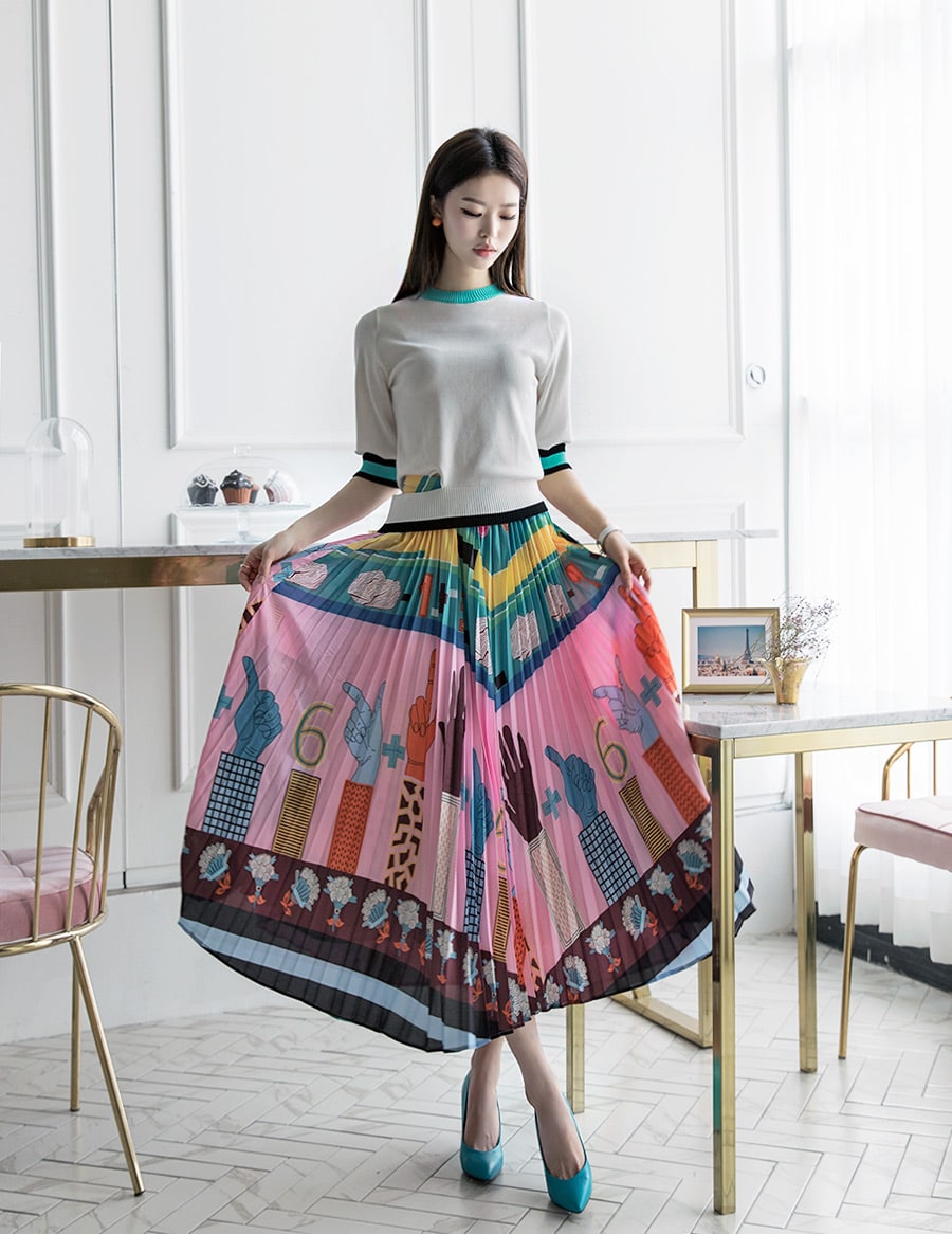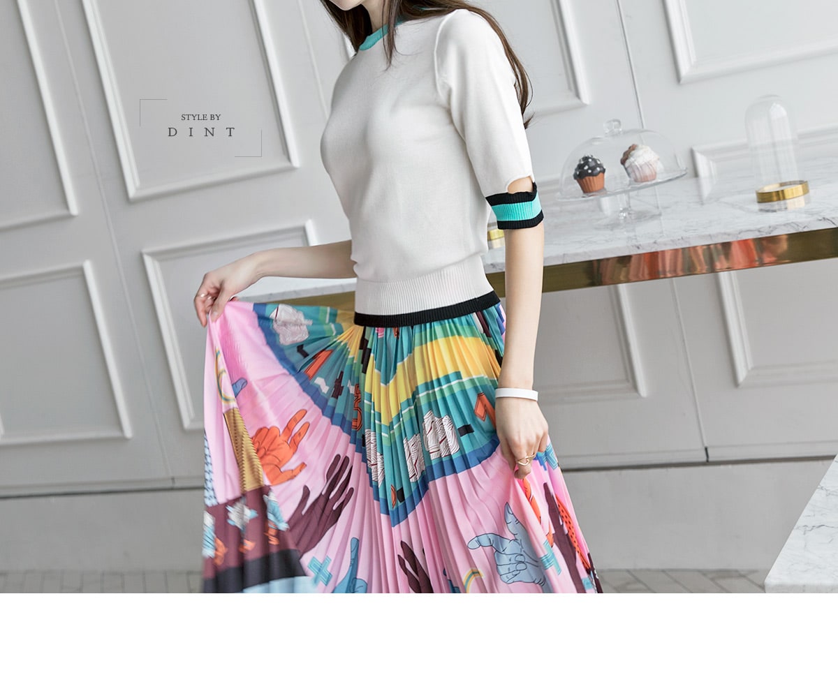 SK1666 일러스트 플리츠 롱 스커트 Pink mix