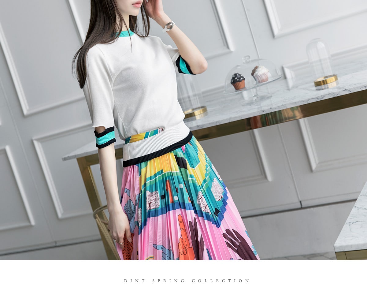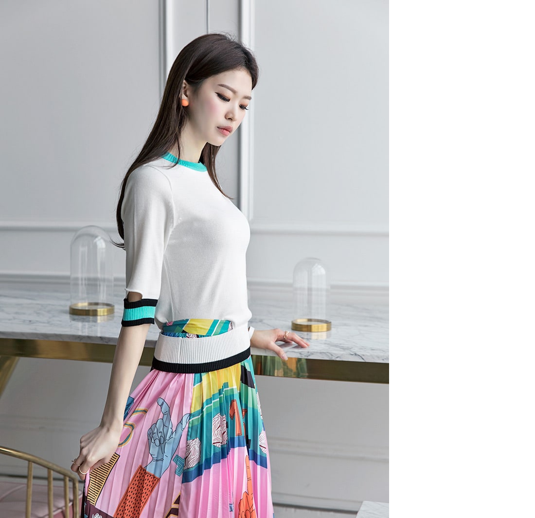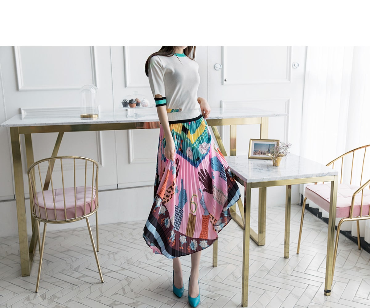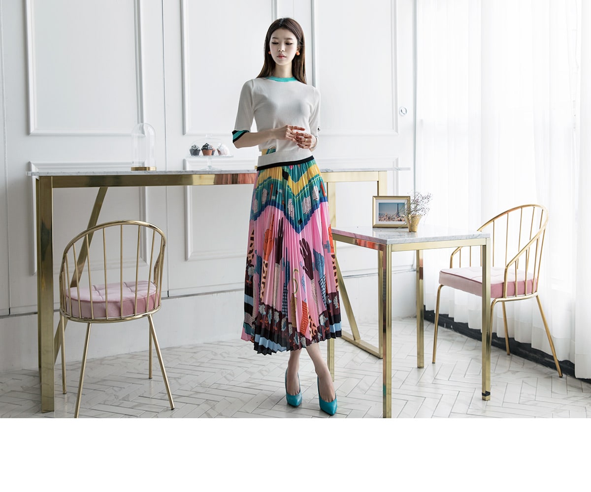 SK1666 일러스트 플리츠 롱 스커트 Pink mix