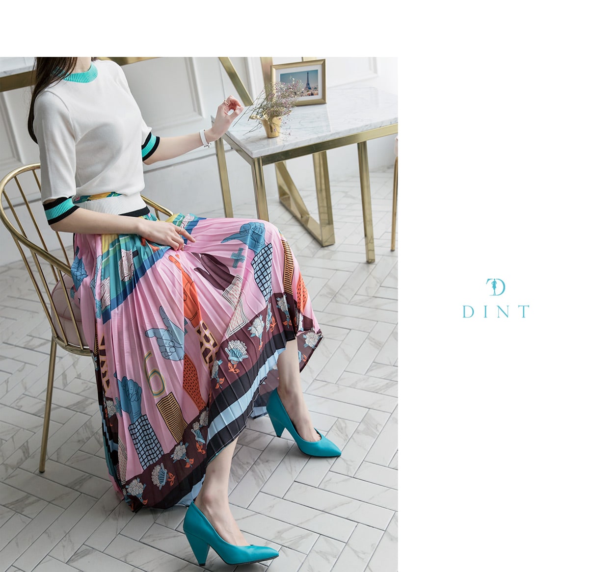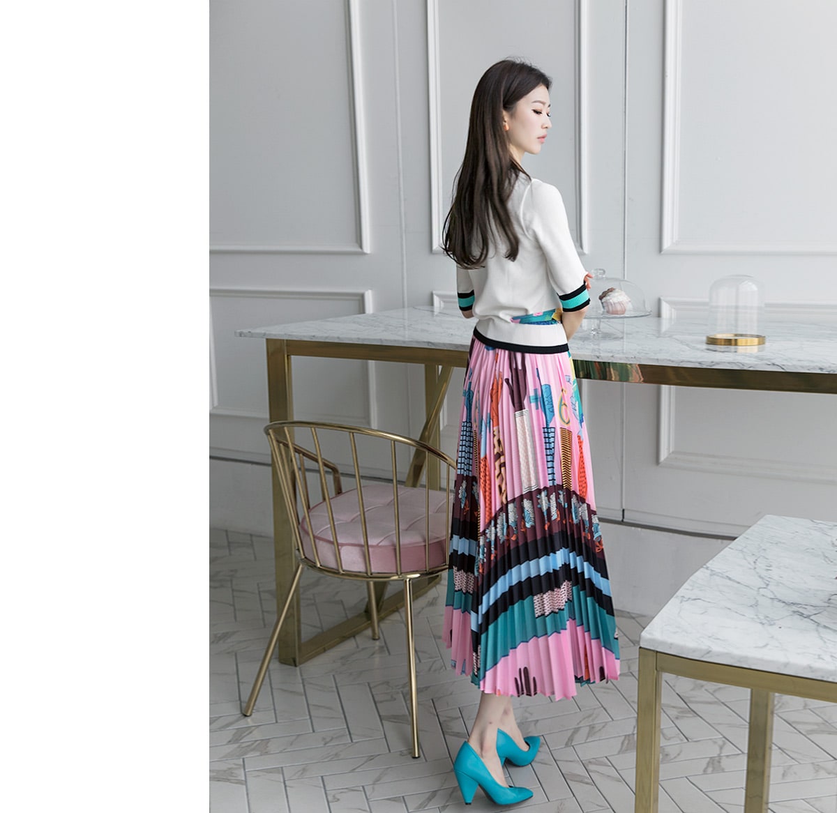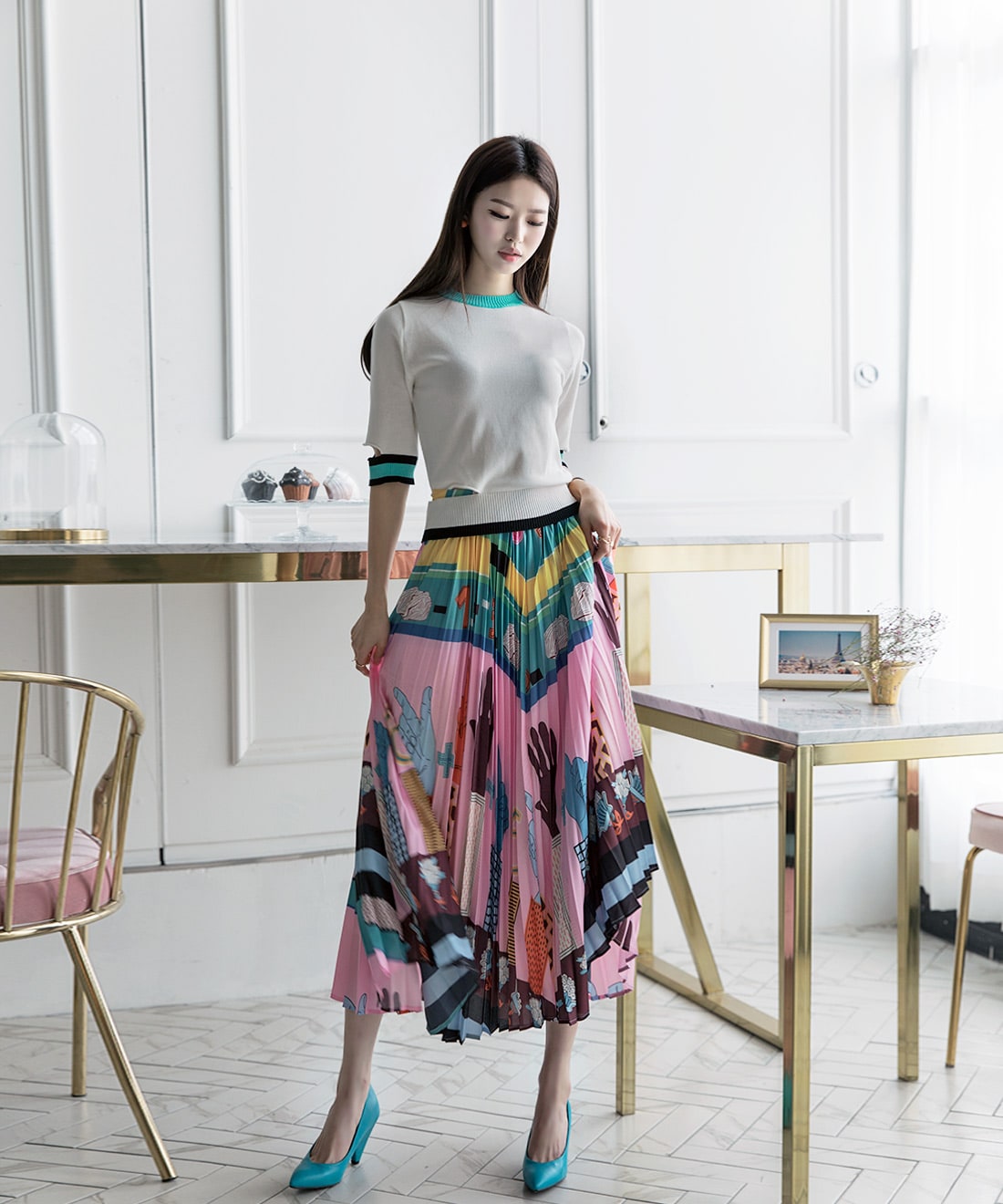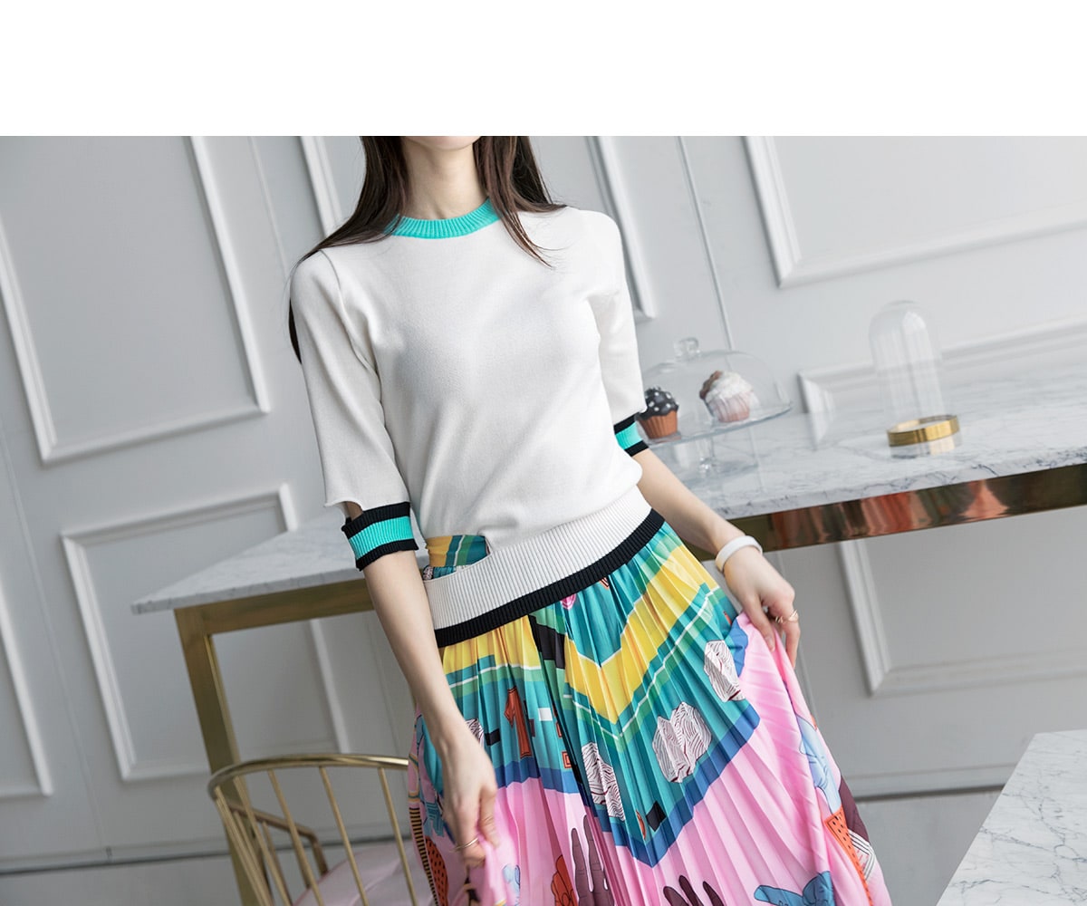 SK1666 일러스트 플리츠 롱 스커트 Pink mix