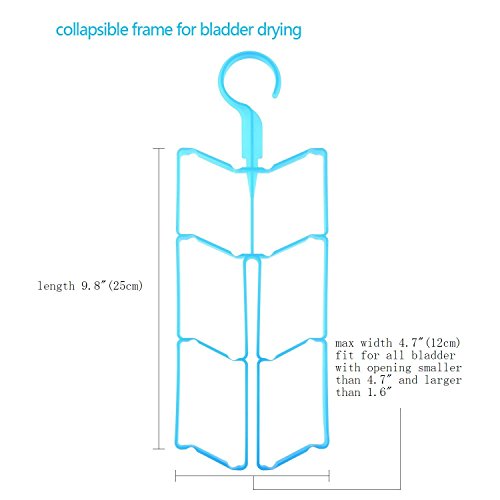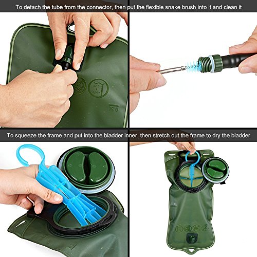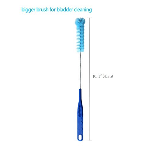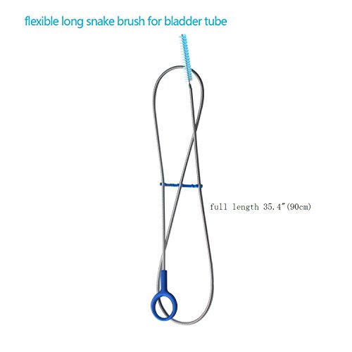 -. Feature : 4 in 1: including 4 items for hydration bladder cleaning and drying----1* flexible snake brush, 1*smaller brush, 1* bigger brush and 1* collapsible frame. / FLEXIBLE SNAKE BRUSH: excellant for hose cleaning,Length of long brush: Approx 90cm / 35.4inch / SMALLER BRUSH: perfect for mouth piece cleaning,Length of small brush: Approx 13cm / 5.1 inch / BIGGER BRUSH: used for bladder cleaning,Length of big brush: Approx 41cm / 16.1 inch / COLLAPSIBLE FRAME: designed for bladder drying, can be squeezed together to fit inside the bladder and allow it to air dry, suitable for any brand bladder with Maximum mouth opening 4.7" and Minimum mouth opening 1.6".