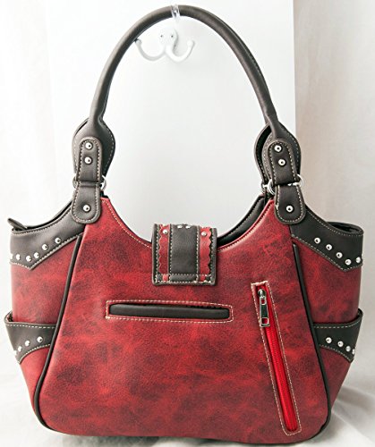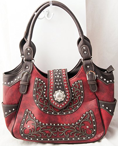 Large western handbag; made from high quality red premium faux/imitation PU leather decorated with brown trim and scroll designs, silvertone hardware, and western rhinestone floral concho on buckle that snaps closed on the front
