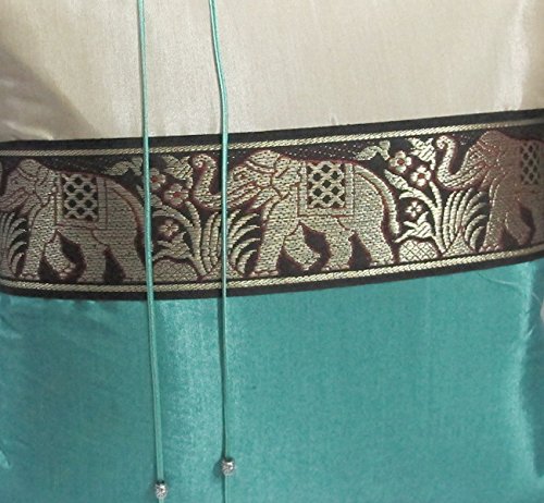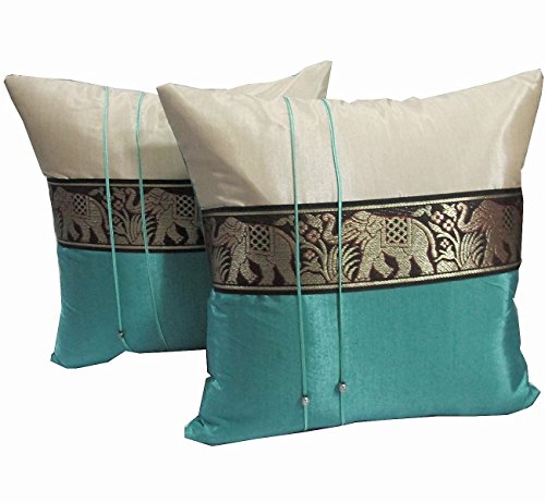 One Pair Ivory Teal Big Elephant Stripe Throw Cushion Cover/Pillow Case Thai Silk for Decorative Sofa, Car and Living Room Size 16 X 16 Inches