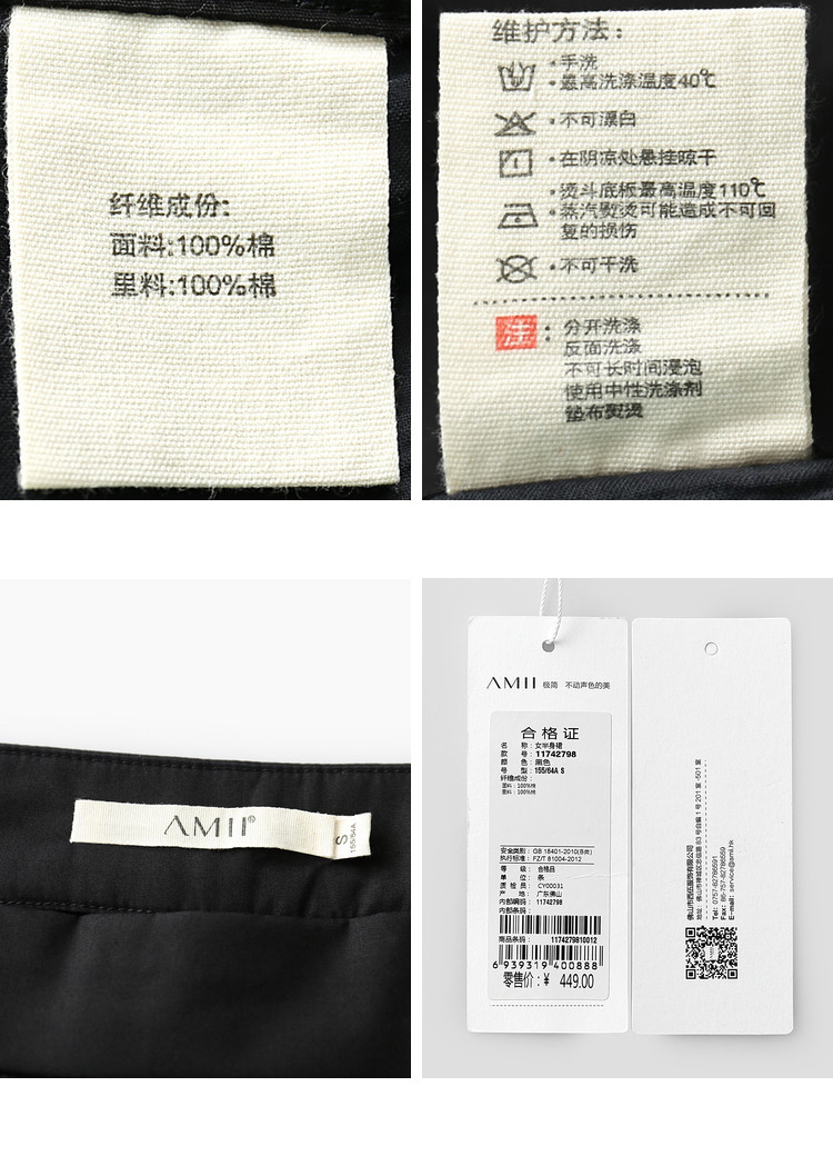 | 洗涤标准: | 悬挂晾干不可漂白40℃以下手洗110℃以下垫布熨烫不可浸泡不可干洗 |