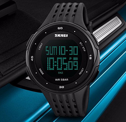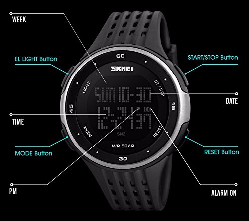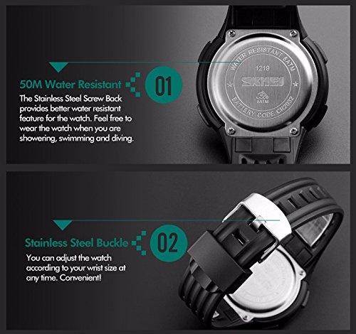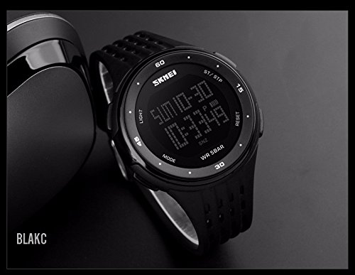 -. Feature : Multifunction: Light,Stop Watch,Waterproof,Shockproof,Calendar,EL Backlight,Alarm Clock, this sport watch is perfect fit with all kinds of sports and it's really an everyday watch. / Suitable for men, and also for women, case diameter is 4.5cm, someone who like large dial watch should love this fashion sport watch. / COMFORT with FASHION: silicone rubber watch band with the minimalism design make it comfortable to wear and lead you to the edge of sport fashion. Perfect for both indoor and outdoor activities, great gift for family and friends. / Waterproof: 164 Ft / 50 M water resist, Support to swim and bathe in cold water. Please DONOT press any buttons underwater, and in case of damaging waterproof ring,please keep it away from steam and hot water. / What you get: Black Sport watch*1, Manual*1, Our friendly customer services.
