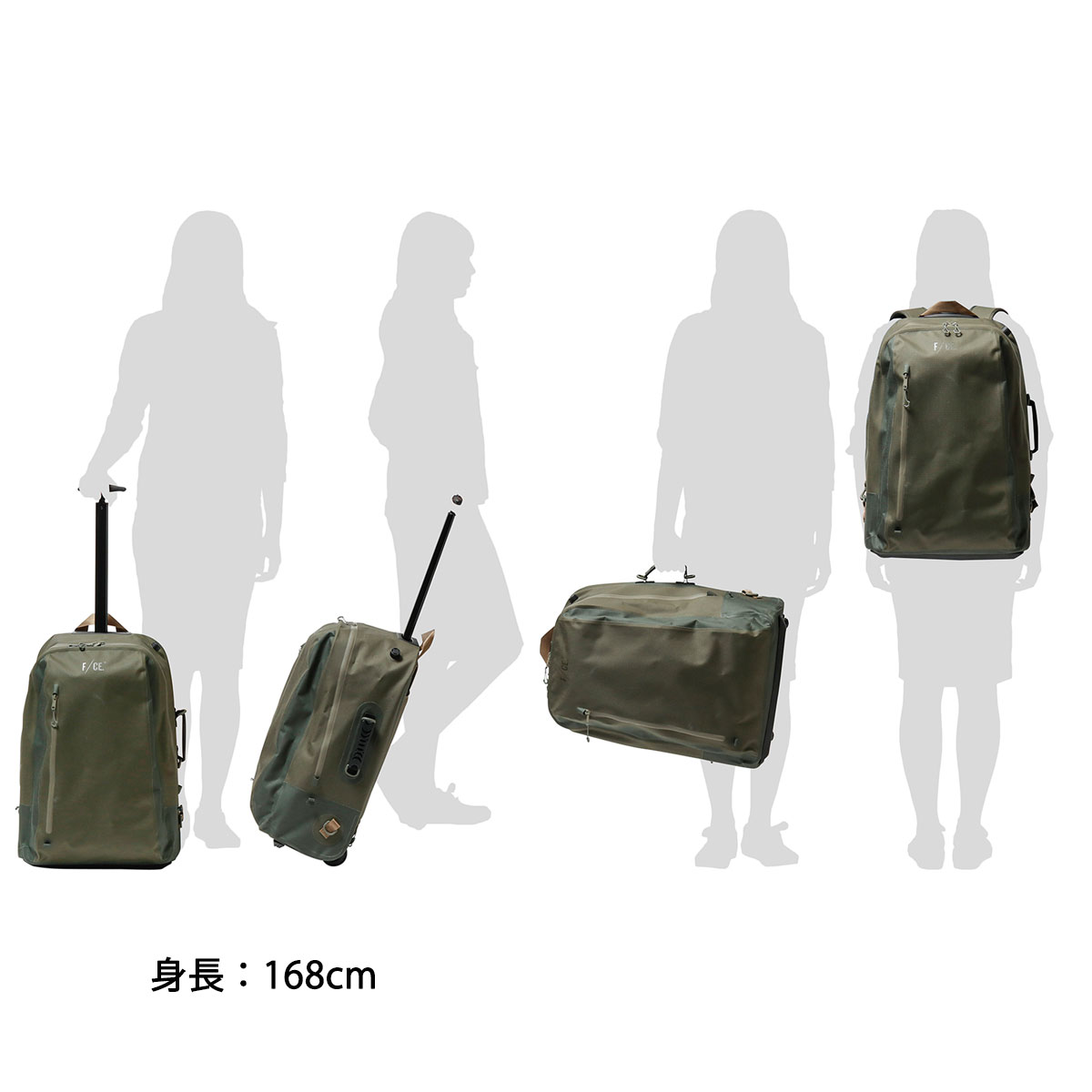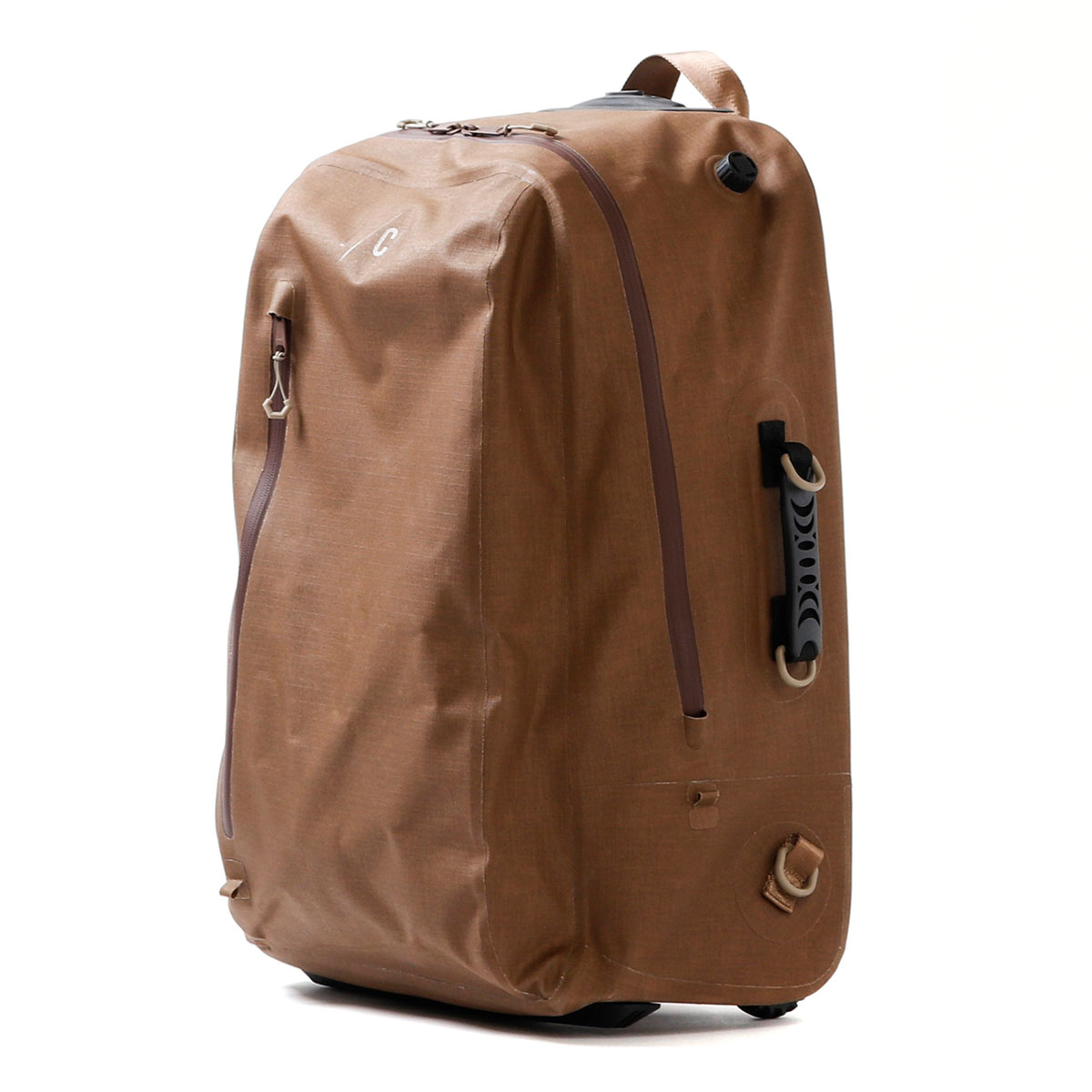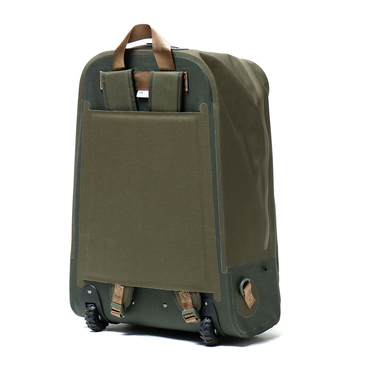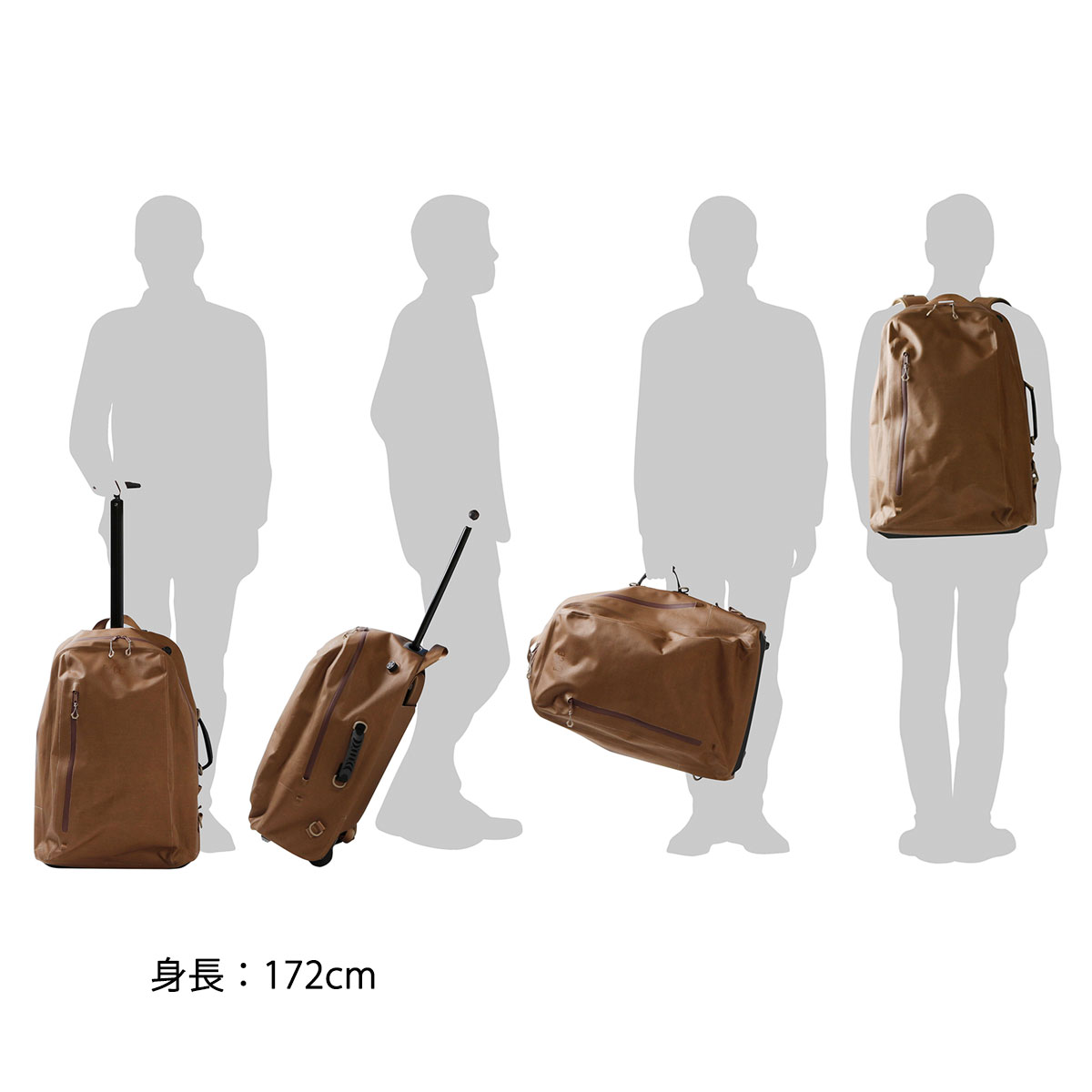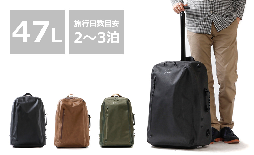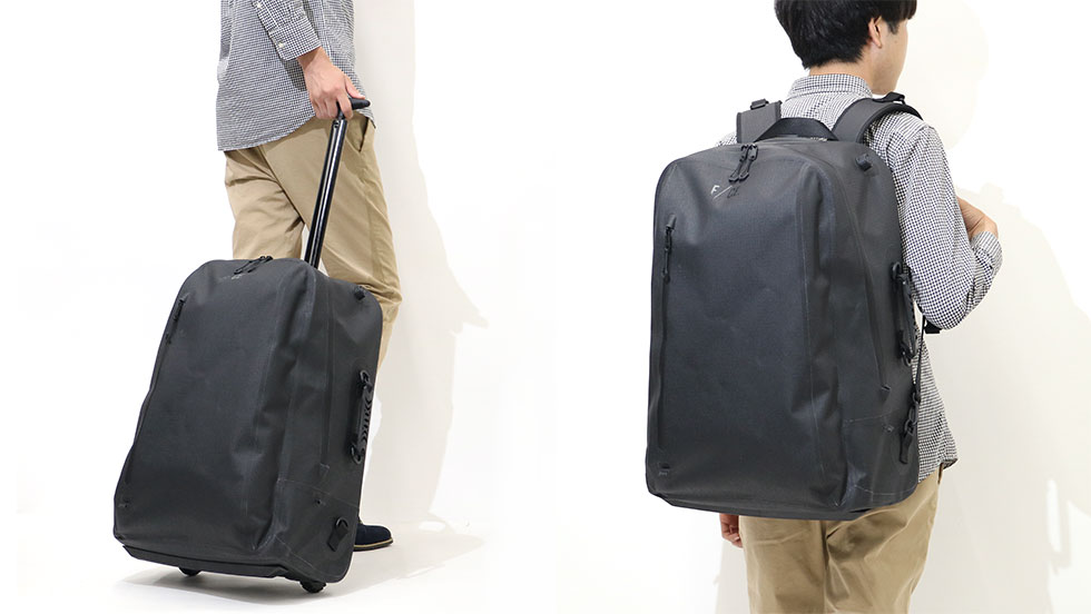 Trolley case of "DRY LINE" with high waterproofness with no sewing making. Not only with the trolley, but with a strap on the back, it can also be used as a backpack 2 WAY specification. There is storage capacity to accommodate about 3 nights in large capacity size.