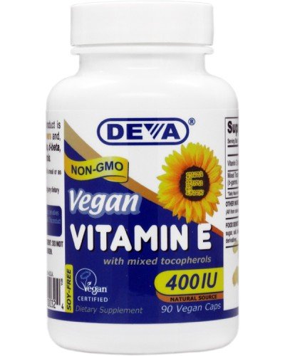 -. Binding : Grocery -. Brand : Deva Vegan Vitamins -. EAN : 0895634000324 -. Feature : Vitamin E from a Natural Source / 400 IU with mixed tocopherols / Vegan Society certified -. IsAdultProduct : 0 -. Label : Deva Vegan Vitamins -. LegalDisclaimer : Actual product packaging and materials may contain more and different information than what is shown on our website. We recommend that you do not rely solely on the information presented and that you always read labels, warnings, and directions before using or consuming a product. Please see our full disclaimer below. -. Manufacturer : Deva Vegan Vitamins -. Model : 68000 -. MPN : 151605 -. NumberOfItems : 1 -. PackageQuantity : 1 -. PartNumber : 151605 -. ProductGroup : Health and Beauty -. ProductTypeName : HEALTH_PERSONAL_CARE -. PublicationDate : 2010-09-15 -. Publisher : Deva Vegan Vitamins -. ReleaseDate : 2010-09-15 -. Size : 90 -. Studio : Deva Vegan Vitamins -. Title : Deva Vegan Vitamins Natural Vitamin E 400iu with Mixed Tocopherols, 90-Count -. UPC : 895634000324