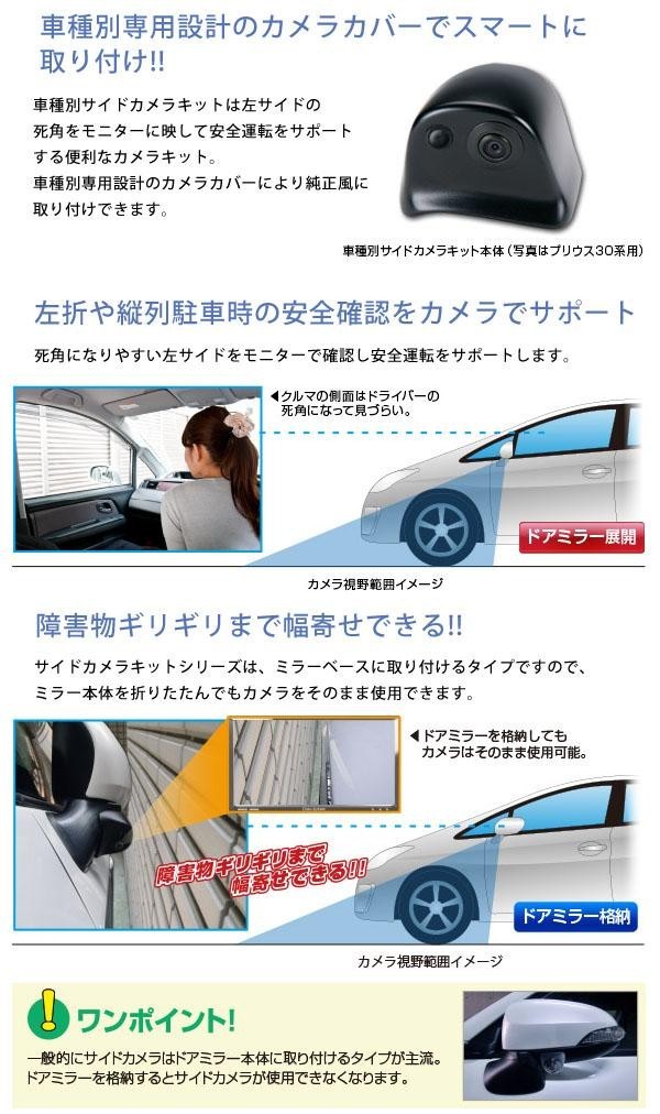 | 車種別サイドカメラキットは、左サイドの死角をモニターに映して安全運転をサポートする便利なカメラキットです。カメラ本体は、高感度スーパーCMOSセンサーを搭載し、明るい場所はもちろん、暗い場所でも障害物が見やすい視認性の高い高画質設計。安全確認をしっかりサポートします。本製品はDC12V車専用品です。 |