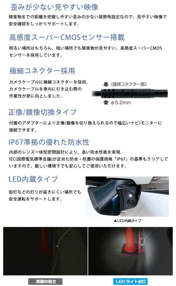 | 仕様 | シングルタイプ (LED内蔵タイプ) 適合車種:ホンダ オデッセイ(RC1・2/H25.11~) 【カメラ本体】 出力映像正像・鏡像映像(ガイドライン表示なし) 有効画素数:約32万画素、水平解像度:約500TV本 画角:水平画角100度・垂直画角80度 映像信号:NTSC ヒューズ:1A 電源:DC9~15V 消費電流:約40mA 動作可能温度:-20~+65度 防水・防塵性能:IP67準拠 【LED制御ユニット】 ヒューズ:2A 電源:DC12V 消費電流:約40mA 動作可能温度:-20~+65度 |