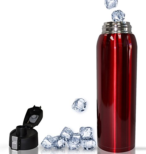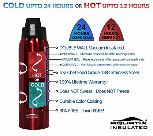 The Aquatix Sporty 21 oz Double Wall Insulated Stainless Steel Water Bottle is perfect for use at the gym, at the office, around your house and anywhere you need to take your beverage of choice with you. Made from durable and sturdy PREMIUM QUALITY, Top Chef 18/8 FOOD GRADE STAINLESS STEEL, this Aquatix Sporty 21 ounce water bottle is a great eco friendly sports bottle. The double wall insulated water bottle is PERFECT for carrying while walking, hiking, camping, use at the gym or just on the go- as it fits MOST car cup holders. No more spills and messes while driving! Ditch those plastic water bottles! GO HEALTHY with this BPA Free, FOOD GRADE stainless steel water bottle that holds a large capacity of liquids 21 fluid ounces and no longer worry about toxins and chemicals leaching into your beverage. Drink crisp, clean, healthy and refreshing drinks from Your Aquatix Water Bottle every time. Just Fill and Go! This sporty bottle features a flip top spout drinking mechanism allows the ease of staying hydrated even while on the go! The flip cap top provides single-handed drinking ability and is perfect for your busy life on the go! Stay hydrated and DRINK MORE WATER with this large capacity 21 ounce water bottle. Double vacuum insulated wall construction contributes to hot teas, soup, coffee or other blends being consistenly hot for up to 12 hours. And, for cold water, smoothies, soft drinks, or anything you may need very cold, 24 hours of insulated confidence, guaranteed cold, period! The bottle will not "sweat", meaning it will not create condensation which may leave a "ring" of liquid on your expensive buried walnut side table. Easy to hand wash or clean, NO aftertaste after cleaning. COLD LIQUIDS or HOT LIQUIDS! This is a double wall insulated water bottle that is made of 18/8 food grade stainless steel water bottle! No other bottle has all the features of our Aquatix Sport Bottle!Feature