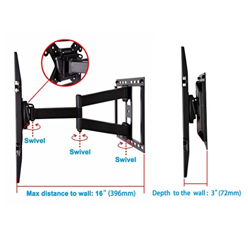 - Feature : +5°/-15° Tilt, +/-5° rotate and swivel side to side for comfortable viewing flexibility, Post-installation level adjustment allows the TV to perfectly level. / Fits for concrete wall/8" or 16" wood studs (fits maximum 16" wood stud spacing, please check the stud spacing first) . Dual articulating arm design, retracts 3" (to wall) to save space, and extends up to 16" from the wall. / All hardware, tool free spring loaded handle, 6' HDMI cable, Bubble level included. Cable management on arm with Velcro cable ties. / Automatic robot welding technology makes whole unit sturdy thus ensures mounted TV stable and secure, and makes welding joint smooth thus whole unit with good appearance. Finish of the mount and all hardware is RoHS (Restriction of Hazardous Substance) certified. / Fits for most of 42-70" TVs sold today. It fits TVs with mounting holes as close as 4"x4" or as wide as 24"x16" (in TV terms - VESA 100x100mm to 600x400mm). Specifically, it fits for VESA 100X100, 200X100, 200X150, 200X200, 300X200, 300X300, 400X200, 400X300, 400X400, 500X300, 600X200, 600X400mm.Please check VESA (mounting hole patern), stud spacing, possible blocked cable/input and TV weight t prior to making purchase decision to determine whether this TV wall mount fits your TV and the installation application.