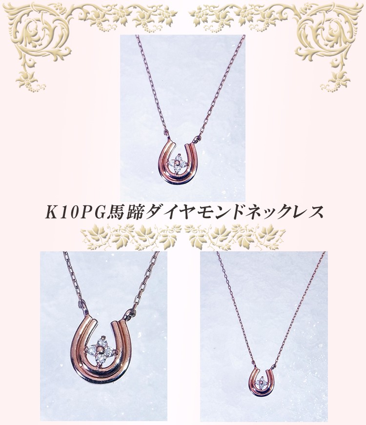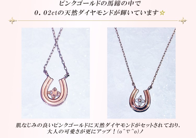 商品説明 ピンクゴールドのかわいい馬蹄ネックレスです。0.02ct天然ダイヤモンドが中で輝いています。