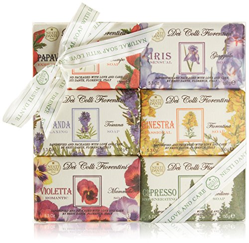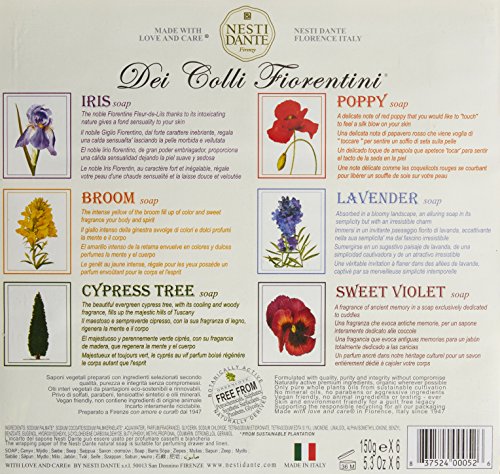Broom for Passion, Cypress for Regenerating, Sweet Violet for Romance, Red Poppy for Exhilaration, Iris for Sensuality, and Tuscan Lavender for Relaxing 6 soaps x 150 gr. eachFeature