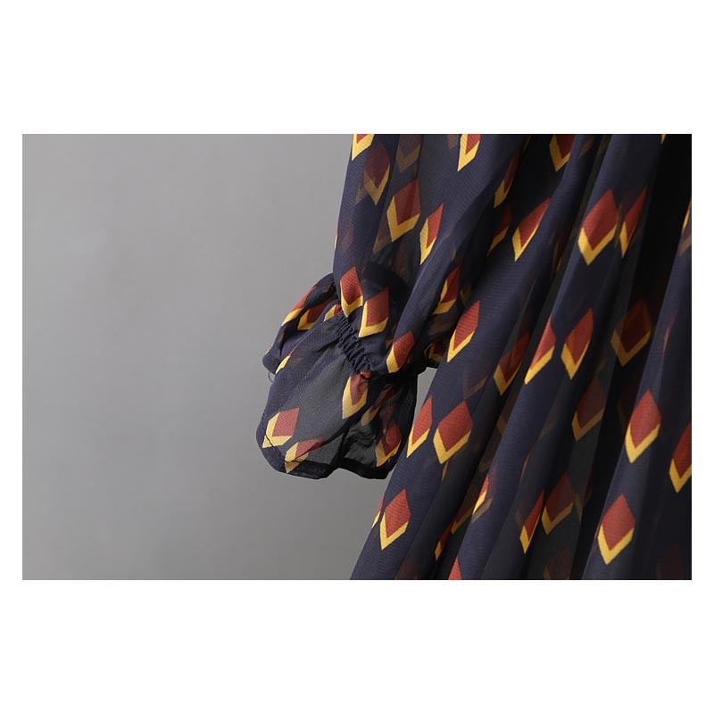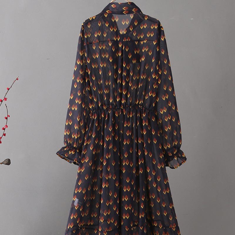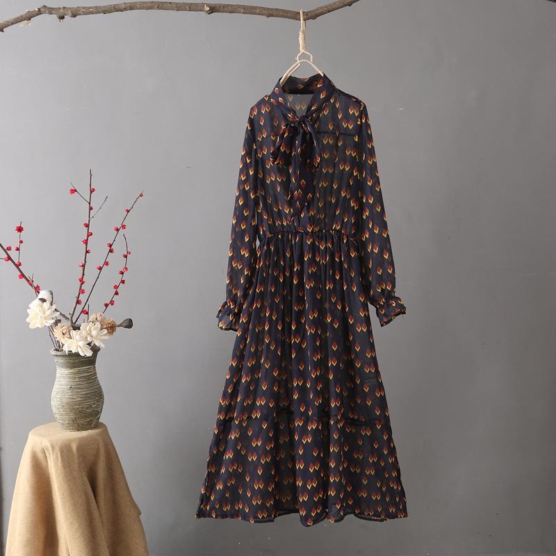 リボンタイ付きでウエストと袖口にギャザーデザインの長袖ワンピース♪
