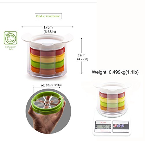 Simply core and cut the fruit into 8 pieces, simultaneously remove the core with ease. Suitable for most medium-sized round fruits such as apples, oranges, pears, peaches.