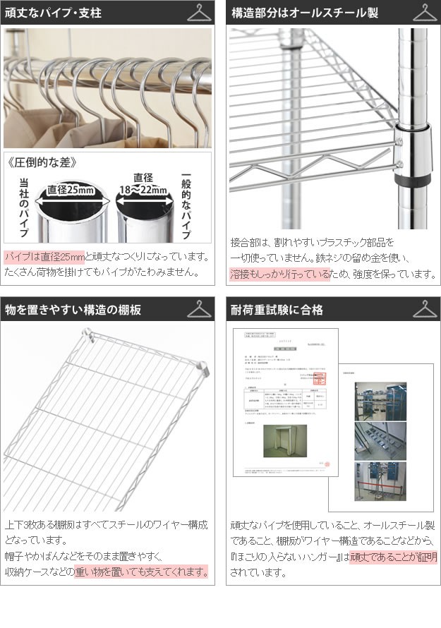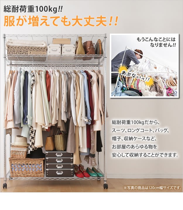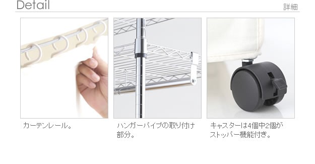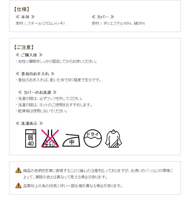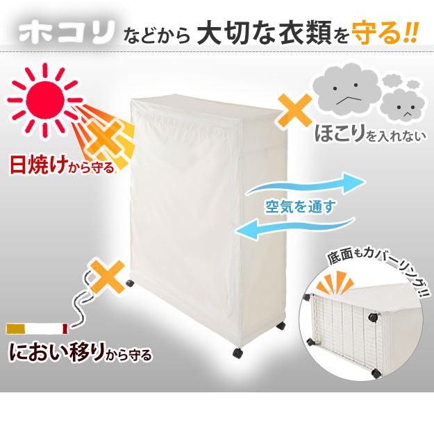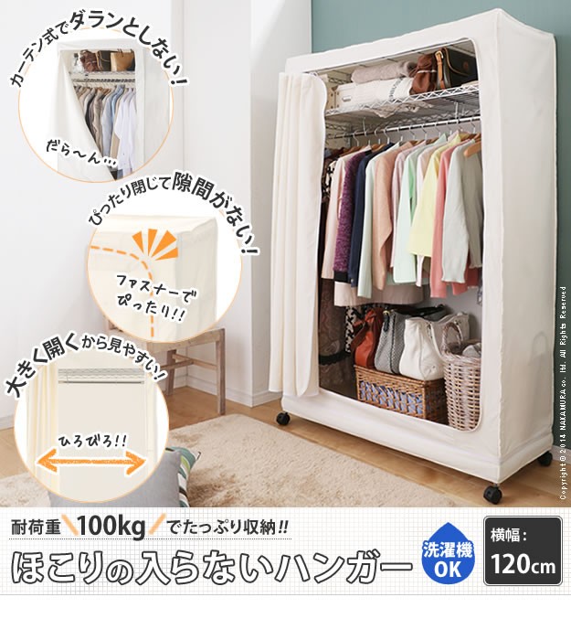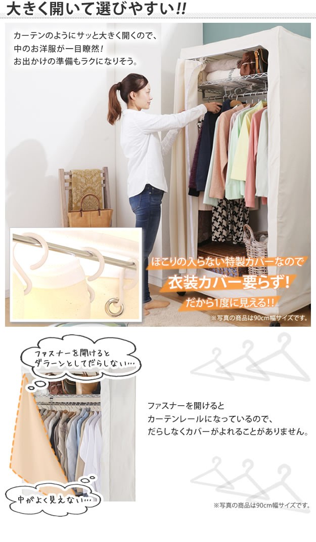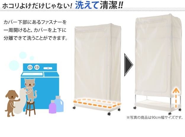 商品について:総耐荷重100kgの頑丈なスチールハンガーラックに便利なカバーを付けました。付属のカバーはハンガーラックを上部から底面まで完全に覆い、ホコリや紫外線から大切な衣類を守ります。カバーは洗濯できるので衛生的。棚板は2.5cm刻みでお好みの高さに調節可能です。便利なキャスター付きで移動もできます!
