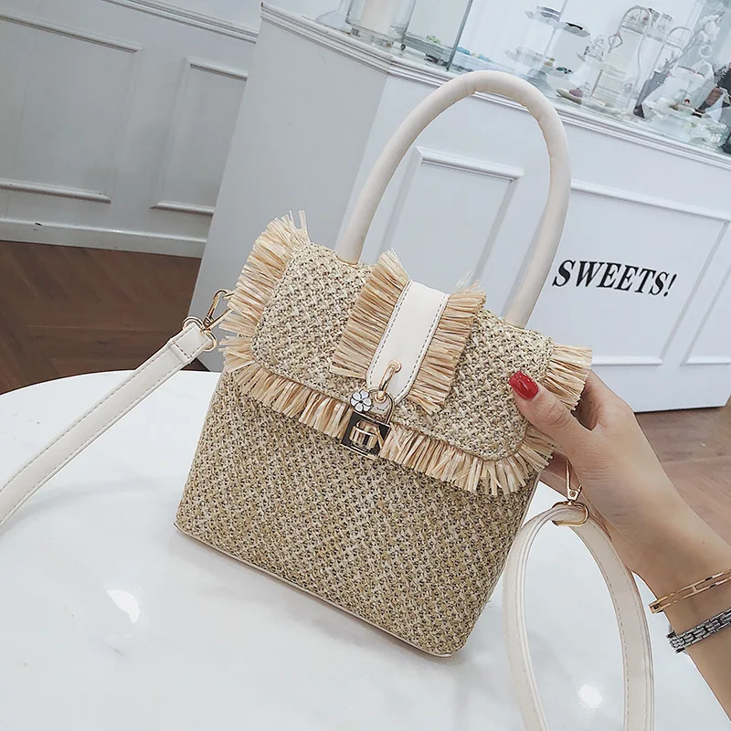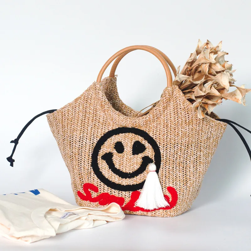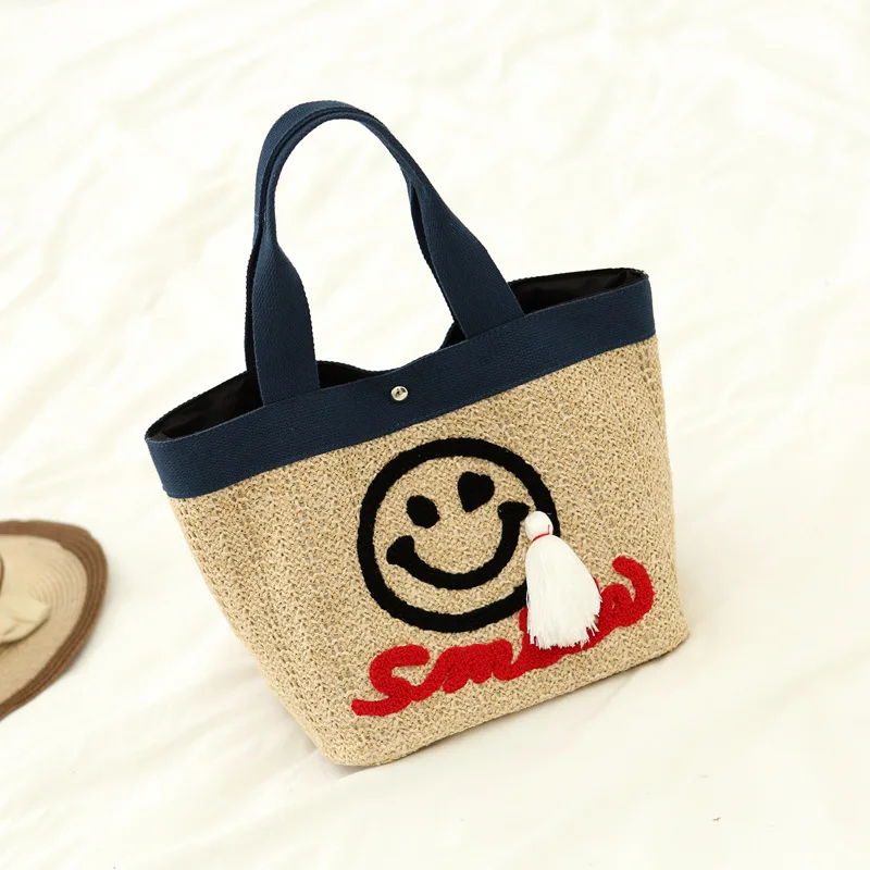 2018ファッション夏andmade袋スマイリーと文字印刷織りハンドバッグかわいいペンダントビーチバッグレディースタッセルトートハンドバッグ