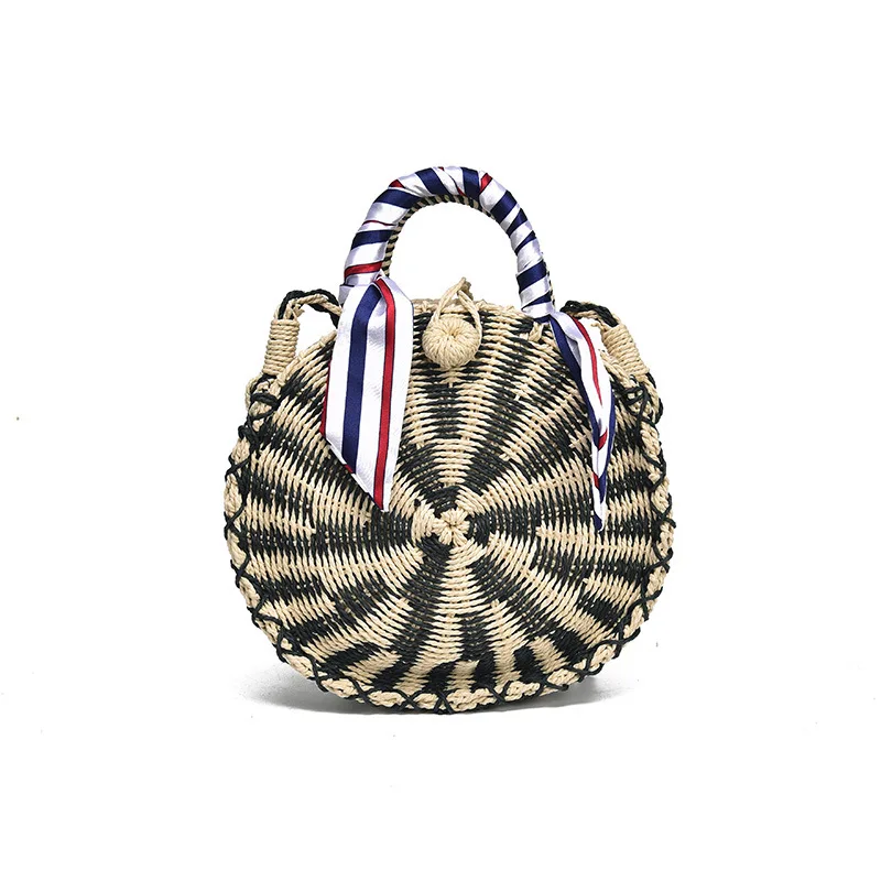 新しい2018夏ラウンドわらバッグ手作り織ビーチハンドバッグ高品質手織りバッグスカーフ装飾ビーチショルダーバッグ