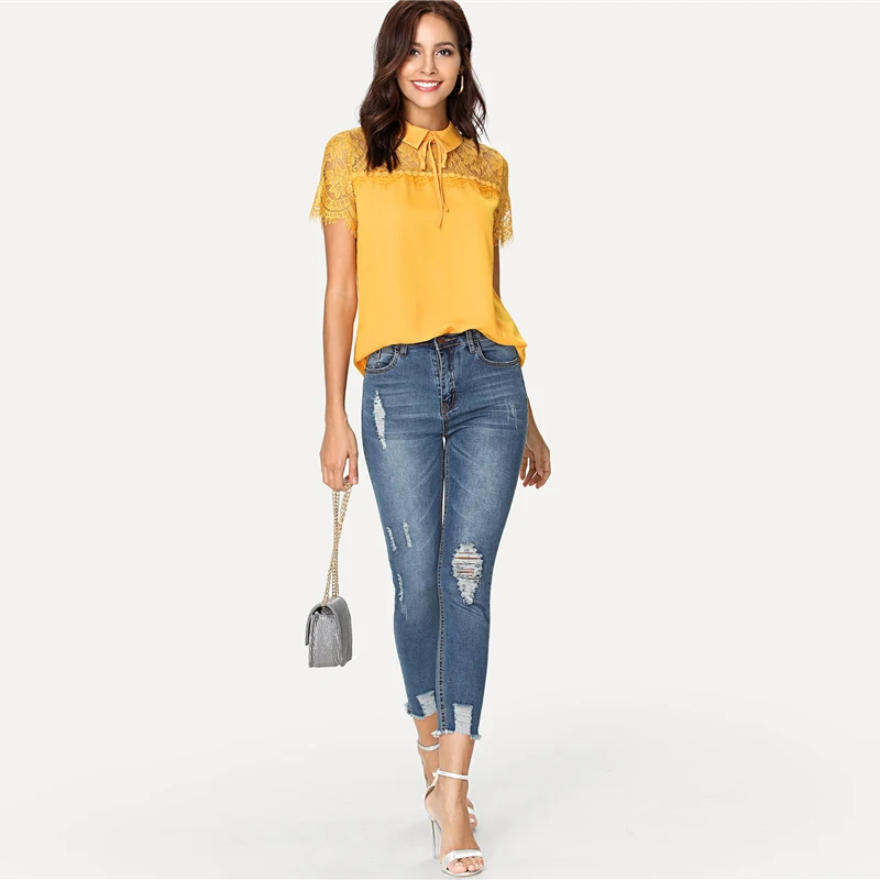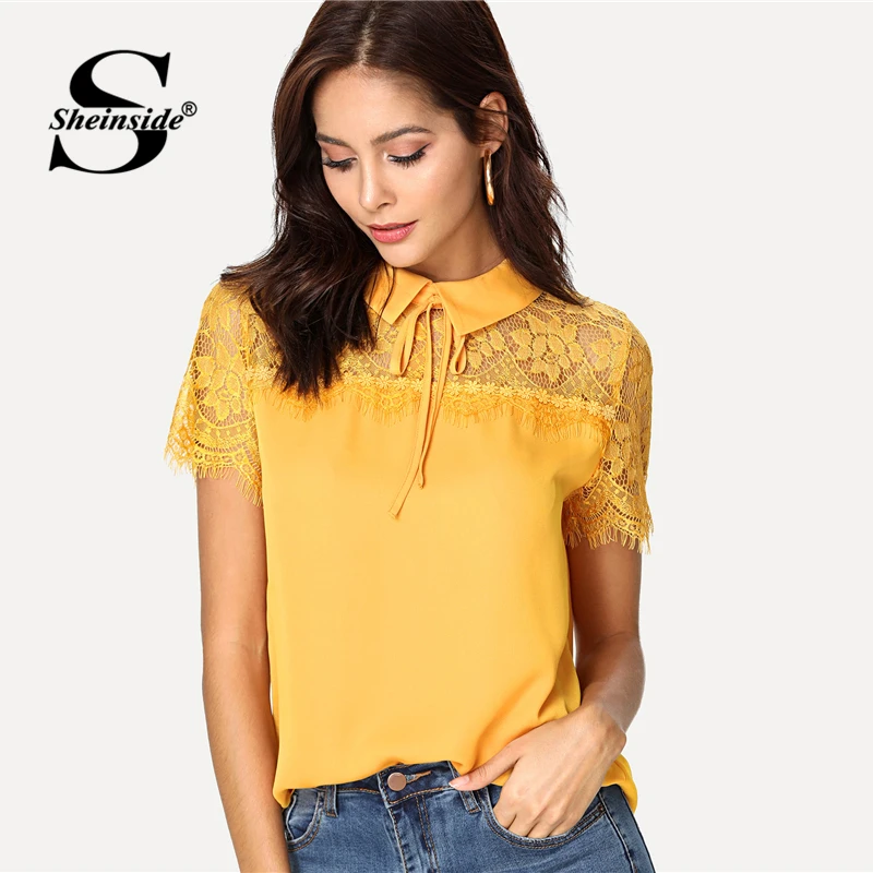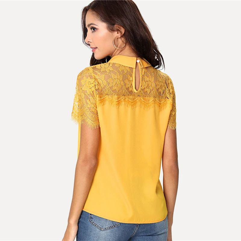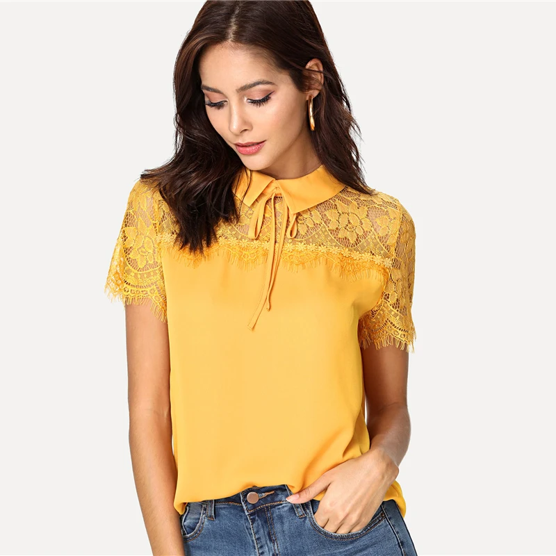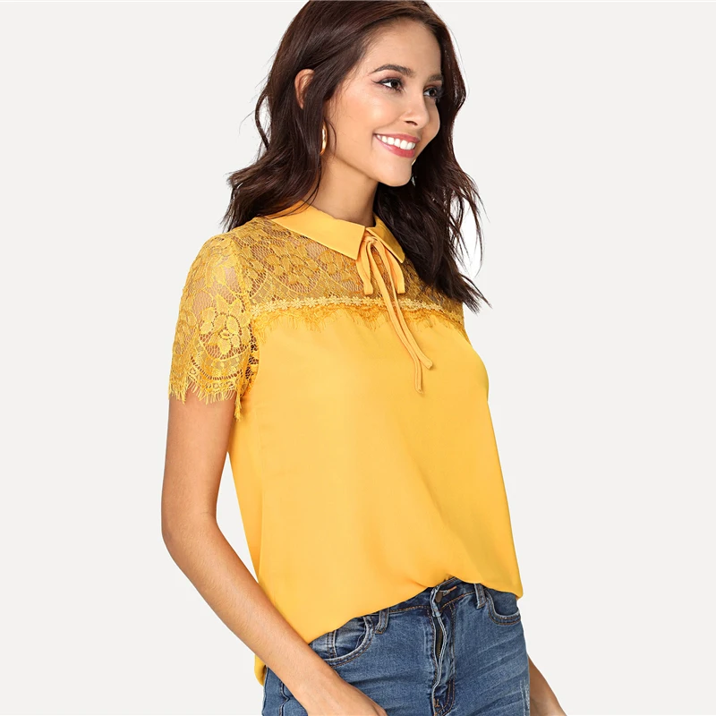 Decoration: Contrast Lace, Sheer, Button, Tie Neck