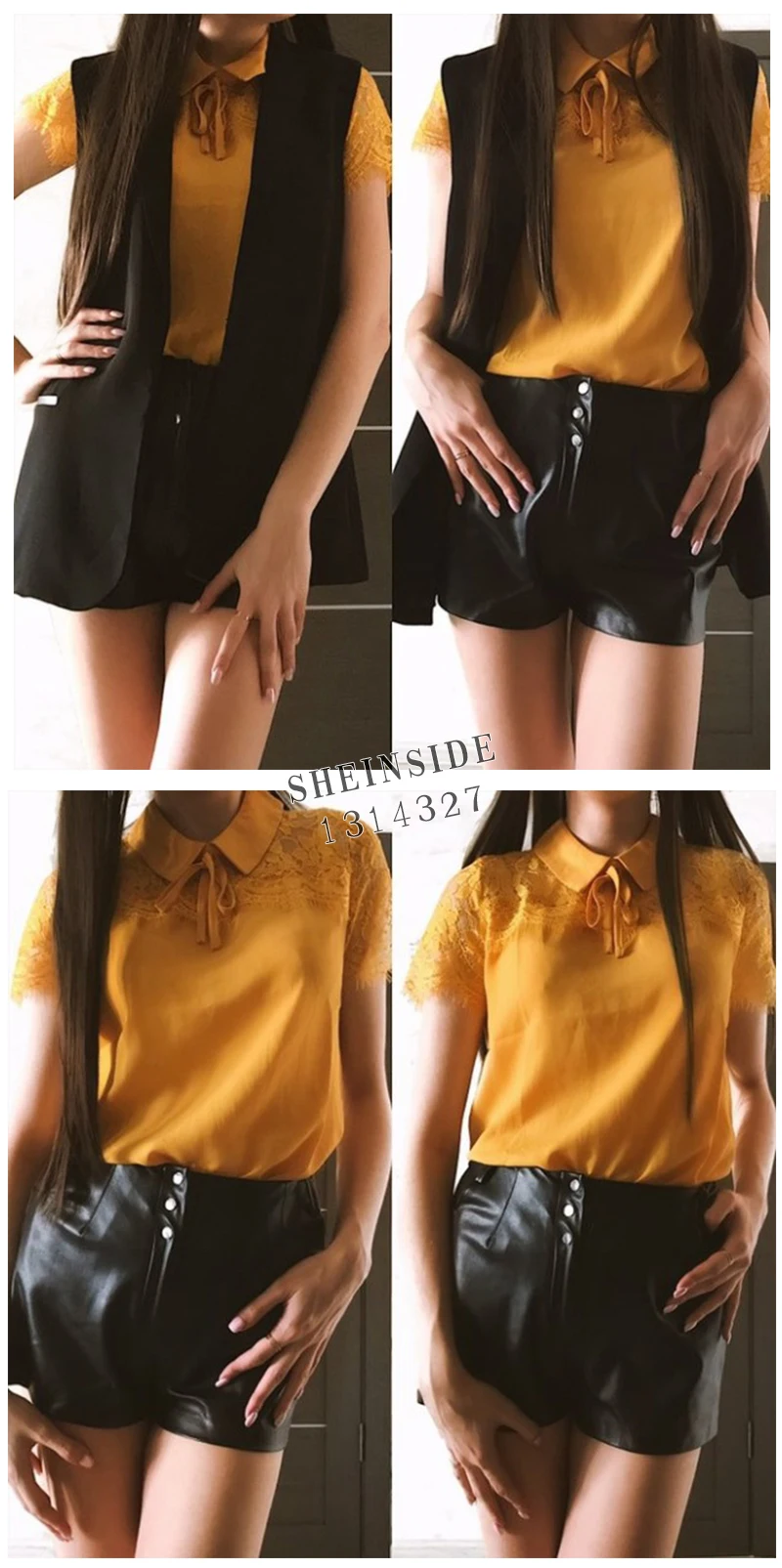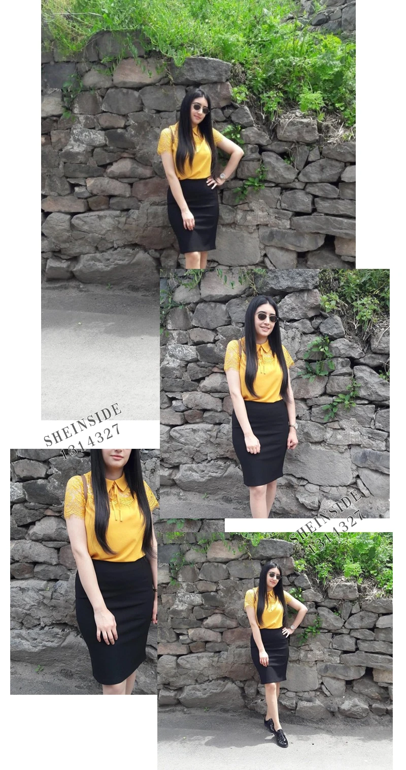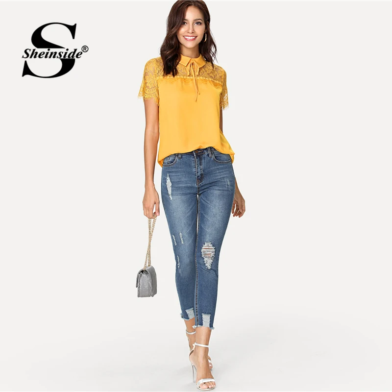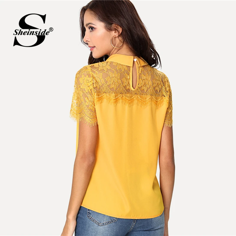 Decoration: Contrast Lace, Sheer, Button, Tie Neck