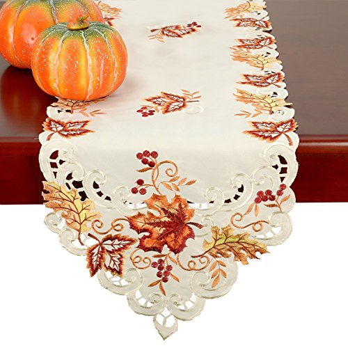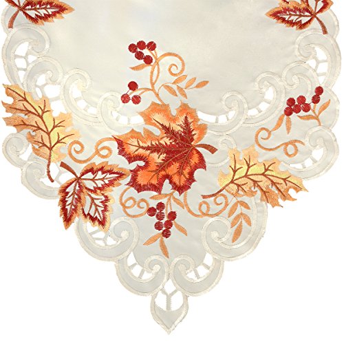 Product Description The leaves appear to be machine-embroidered in rick colors. The design of this table runner will be perfect for your dining table during the fall season. It looks very expensive and adds so much class! 0