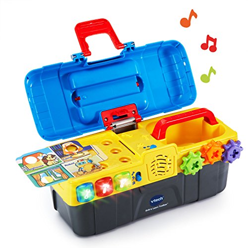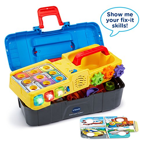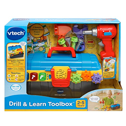 -. Feature : Fix and play with the Drill and Learn Toolbox by VTech; open this toddler-friendly toolbox and get ready for role-play fun with the included electronic fix-it tray, working toy drill, hammer, wrench, nails and screws / Working drill spins the gears and drills screws into the electronic tray's holes; turn the gears to build motor skills and hear mechanical clicking sounds / Press light-up buttons for fun songs and to learn about a variety of tools, how they're used and the sounds they make / Insert the double-sided instruction cards and learn about colors and numbers while pretending to make repairs; includes an electronic fix-it tray, drill, hammer, wrench, nails and screws / Requires 2 AA batteries (batteries included for demo purposes only; new batteries recommended for regular use); intended for ages 2 to 5 years