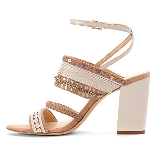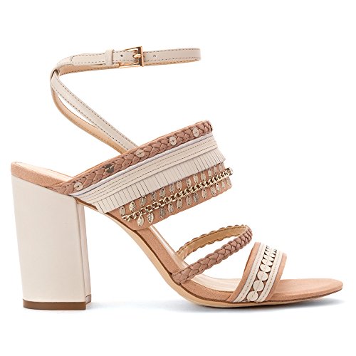 Chunky-heeled sandal featuring mixed-media straps with fringe, braiding, and decorative chain