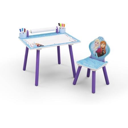 -. Brand : Delta -. Color : Blue -. Feature : Includes 1 desk and 1 chair Recommended for ages 3-6; chair holds up to 50 lbs Tabletop features a dry-erase surface / Includes 16' paper roll with ready to color images Made of engineered wood and solid wood Durable and easy-to-clean finish / Scratch-resistant finish protects the colorful graphics Assembled dimensions: 23.5"W x 17.5"D x 17"H / Delta Children's desk requires easy assembly Meets or exceeds all safety standards set by the CPSC / Features bright Frozen graphics throughout -. ProductGroup : Furniture -. ProductTypeName : HOME_FURNITURE_AND_DECOR -. Title : Fun Delta Children Disney Frozen Art Desk