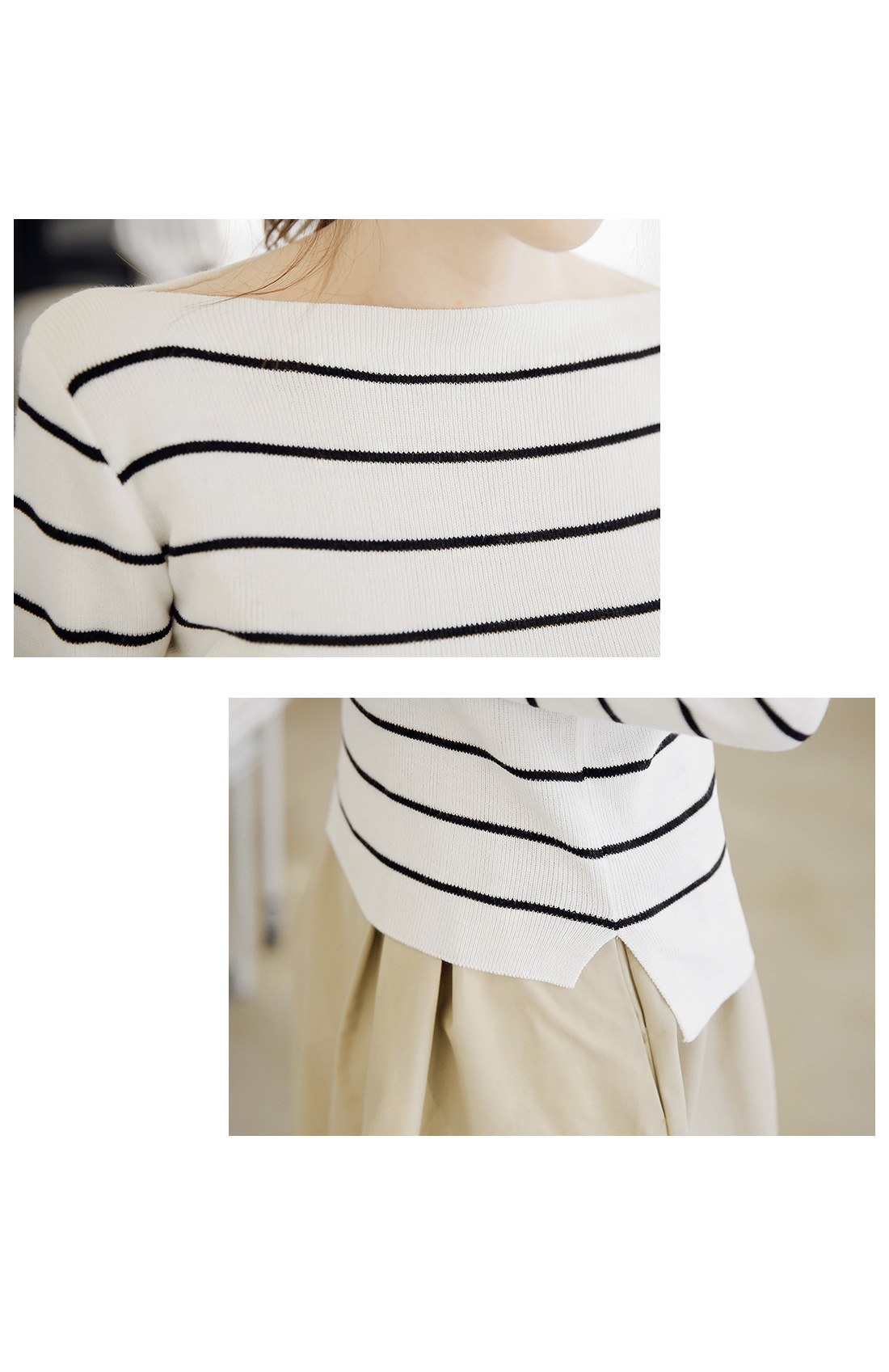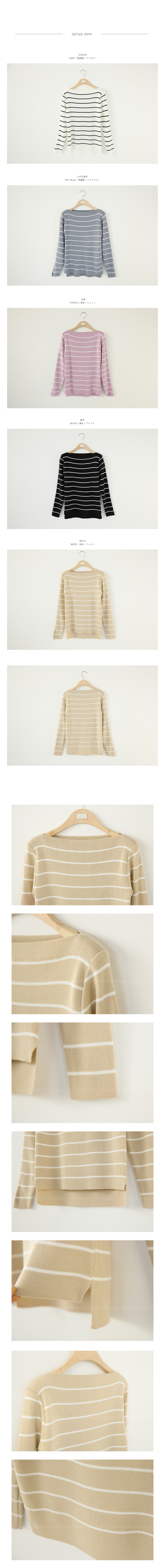 여성스러운 보트넥 디자인~ 스트라이프로 데일리한 포인트룩 완성! 탄탄한 짜임의 니트 소재감으로 늘어짐없이 편안한 핏을 연출해주구요 슬림한 디자인으로 데일리하게 코디하기 좋은 니트탑이에요~ 보트넥 디자인으로 여성스러운 느낌을 연출해 주는 아이템이구요 스트라이프 패턴으로 밋밋하없는 룩을 완성해 주는 아이템이랍니다! 스커트,팬츠 등 어디에 매치해도 두루두루 잘 어울리는 니트에요^^*
