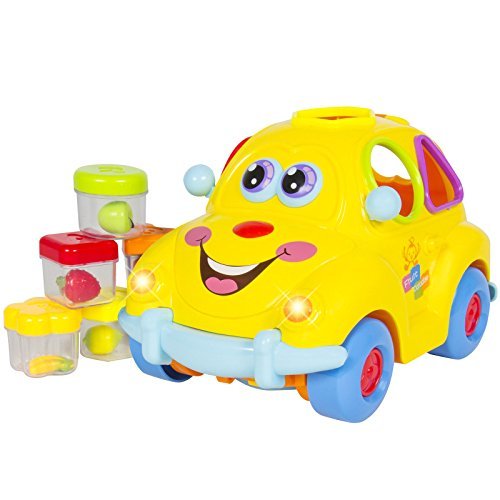 NEW PRODUCT WITH FACTORY PACKAGING - Bump & Go feature allows it to change directions and run when it bumps into something. - Has holes to insert the colorful ABC and 123 fruit shapes. - Fun cartoon style and durable sturdy quality. - The hole in front allows you to attach a string to pull the car (string not included). - Recommended age: 18 months and above. - Comes with switch to turn music on or off. SPECIFICATIONS: Product Dimensions: 7"x4.5"x5" Weight:0.5 lbs Color: Yellow PLEASE NOTE: Our digital images are as accurate as possible. However, different monitors may cause colors to vary slightly.Feature