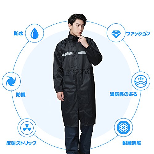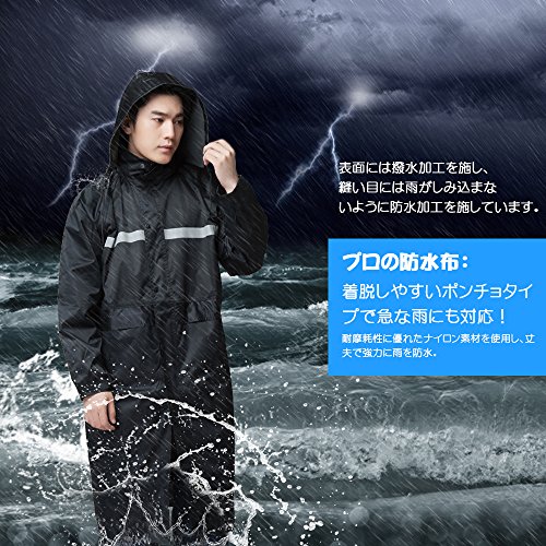-. Feature : 強い防水機能:通湿素材を採用され、水滴よりも小さいな穴が無数に空いており、外からの雨は弾き、レインウエア内の蒸れはその穴から逃すという特徴です。レインウェアは上下とも、裏地全体にメッシュ素材を使用して、通気性が良いです。 / 着脱簡単:着脱しやすいポンチョタイプで急な雨にも対応! 耐摩耗性に優れたナイロン素材を使用し、丈夫で強力に雨を防水。ボタンの下は、しっかりとしたファスナーが付いているので、防水機能アップ。袖口はゴムが入っているので、雨が入りにくい仕様になっています。 / 男女兼用:シックでカジュアルな無地デザインなので、メンズ・レディース関係なく着用できます。 男性はかっこいい着こなしに、女性はかわいい着こなしが楽しめます。 雨の日でも、オシャレに楽しめるレインウェア、ひとつ持っておくことで、あらゆる場面で活躍してくれるので。 / 携帯と収納便利:折りたたんで収納袋に入れると、スモールサイズなので、持ち運びに便利です。 フリーサイズ、男女兼用。しっかりとした厚みで雨を防ぎます!防水、防雪はもちろん 、防汚効果も高いです。 / 人間工学設計:便利なファスナーが全て隠れる比翼仕立てで、雨を防ぎますし、レインコートがさらにオシャレに見えます。背面に幅広の反射テープを縫製しました。夜間の走行、通勤・通学の安全確保に。