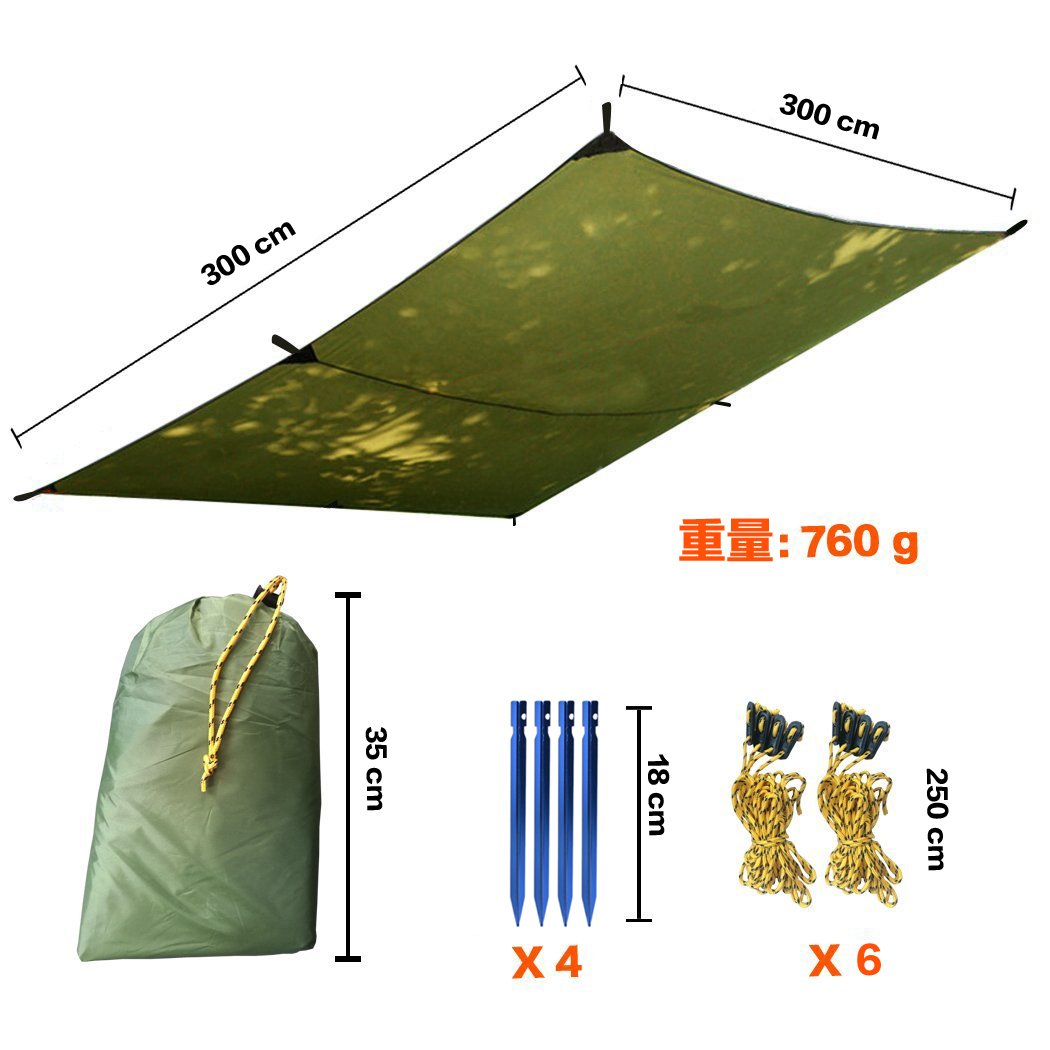 Package Contents: 1 tarpent x 1, nylon rope x 8 (200 cm), peg x 4 (16 cm), storage pack x 1.