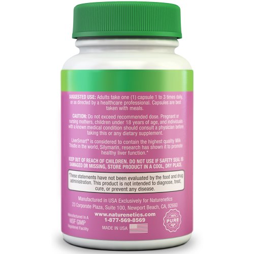 -. Binding : Health and Beauty -. Brand : Naturenetics -. EAN : 0820103423137 -. Feature : LiverSmart; USA made & independently tested to confirm supplement strength and purity / 250mg of milk thistle per capsule, standardized to 80% silymarin, plus 5 additional ingredients for further antioxidant support* / Supports healthy liver function* and a quality of life you deserve! / No additional, non-active ingredients (e.g. no fillers or flow agents), vegan, gluten-free, Non-GMO; the highest quality liver cleanse supplement we can produce / Includes risk free "no change, no charge" 100% money back guarantee -. IsAdultProduct : 0 -. Label : Naturenetics -. LegalDisclaimer : * These statements have not been evaluated by the Food and Drug Administration. This product is not intended to diagnose, treat, cure or prevent any disease -. Manufacturer : Naturenetics -. ProductGroup : Health and Beauty -. ProductTypeName : HEALTH_PERSONAL_CARE -. Publisher : Naturenetics -. Studio : Naturenetics -. Title : LiverSmart; Tested Milk Thistle Liver Cleanse Formula - Supports Healthy Liver Function* - Perfect For Antioxidant Benefits & Ongoing Liver Support* - 80% Silymarin - 6 Active Ingredients - 60 Vcaps -. UPC : 820103423137