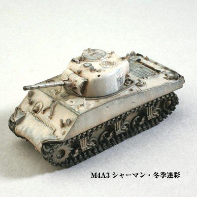 タカラ 1/144 ワールドタンクミュージアム Series 08【バルジの戦い】-149 M4A3シャーマン中戦車 冬季迷彩 単品。 第二次世界大戦中1944年12月16日。このとき、アルデンヌの森一帯で歴史的な戦闘が繰り広げられた。その名は「バルジの戦い」。「バルジの戦い」とは第二次世界大戦中の西部戦線におけるナチスドイツ最後の攻勢作戦の事です。バルジとは地名ではなく「出っ張り」などを意味する英単語で、ドイツ軍の進撃により、連邦軍の戦線が一部突出されたことから連合軍により名付けられました。またこの戦いは「バルジ大作戦」というハリウッド映画にもなり1965年に公開されました。Feature