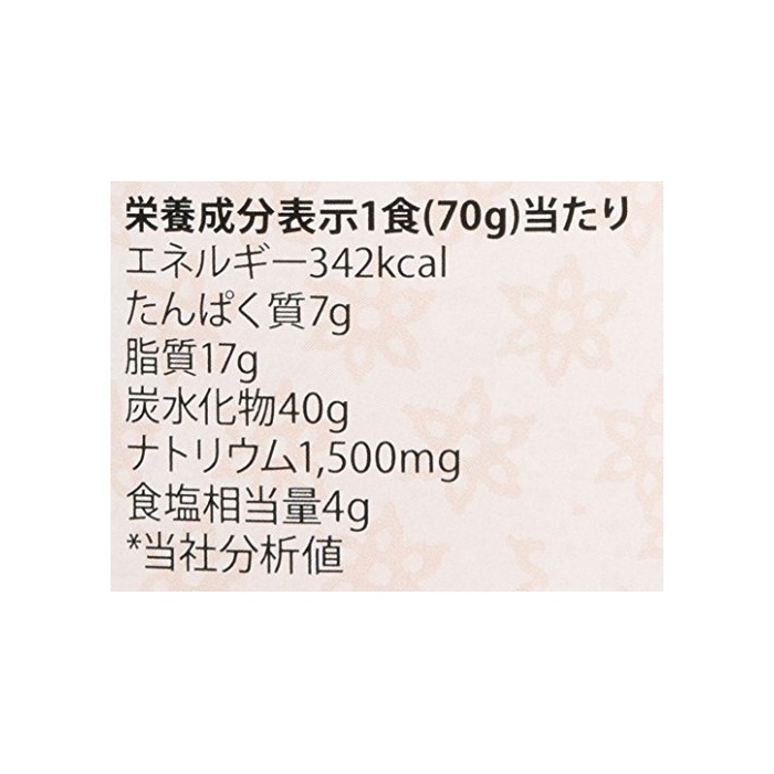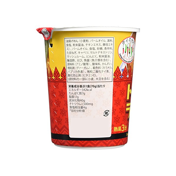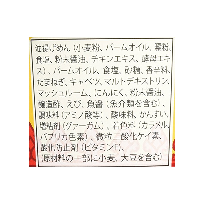 원재료:유부 면(소맥분,팜 오일,전분,식염,분말 간장,치킨 엑기스,효모 엑기스,팜 오일,식염,설탕,향신료,타마 파,양배추,말《도데키스토린》,mash 룸,마늘,분말 간장,양조초,새우,어장(어패류를 포함한다)고, 조미료(아미노산등)고, 신맛료,물어 들이마시고, 증점제(《구가무》)고, 착색료(카라멜,파프리카 색소)고, 미립2산화 규소,산화 방지제(비타민E)고,(원재료의 일부에 밀,대두를 포함한다)