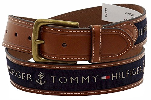A classic Tommy Hilfiger belt that goes great with jeans and khakis. A mix of cowhide and buffalo split leather, this belt is durable and fashionable. A cotton fabric inlay runs the length of the 1 3/8 inch belt. Printed on the fabric is the Hilfiger logo and name with anchors in-between. The sturdy buckle is antiqued brass.