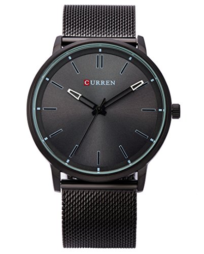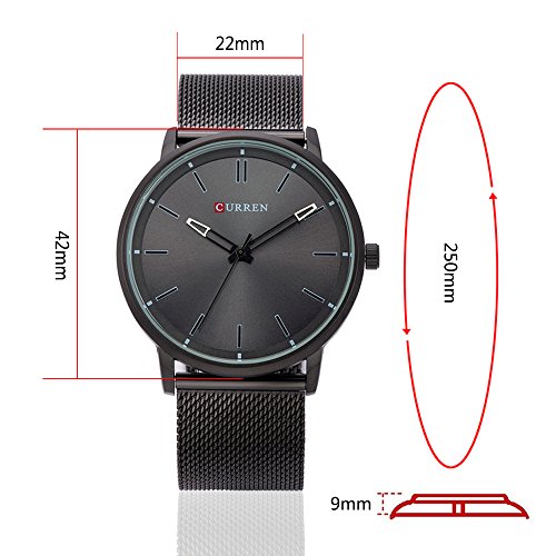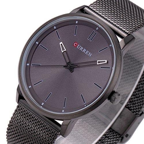 CUEEEN CURREN 손목시계 맨즈 심플 아날로그 바 인덱스 스테인레스 밴드 메쉬 슬라이드 버클 블랙
