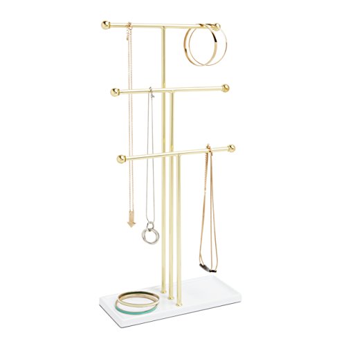 Messy, tangled necklaces making an appearance in your jewelry box or drawer more often than you would like? Put an end to that with Trigem, the hanging jewelry organizer from Umbra. This modern, three-tier, tabletop necklace holder features three horizontal bars at different heights so you can spread out and organize necklaces of different lengths while at the same time keeping them tangle-free!