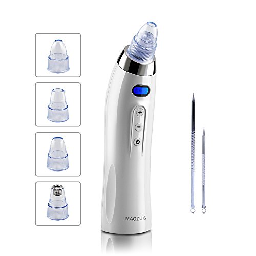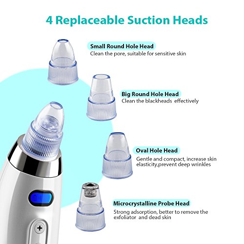 - 4 Replaceable Suction Heads and 5 Suction Level -- With big round hole head x1, small round hole head x1, oval hole head x1, microcrystalline probe head x1, the blackhead remover can simply clean your face without any irritating technology and harsh chemicals. With 5 adjustable suction level,the blackhead remover machine can also be used in other parts like chest and back areas which need to be cared.