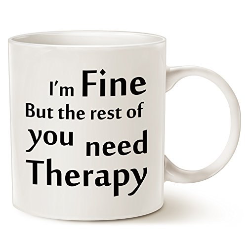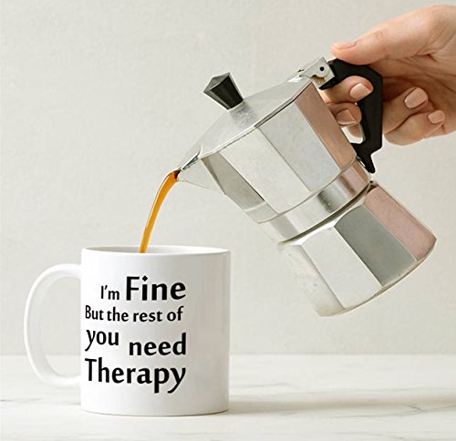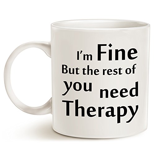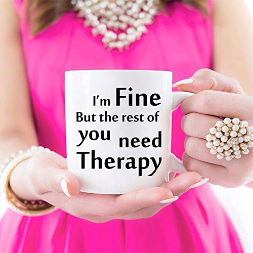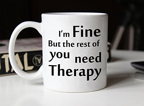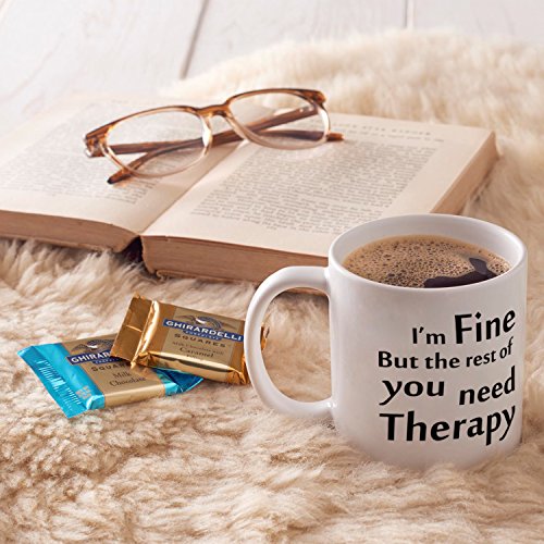 Funny Therapy Coffee Mug Christmas Gifts - I'm fine but the rest of you need therapy - Best Gag Gifts Porcelain Cup White, 14 Oz by LaTazas