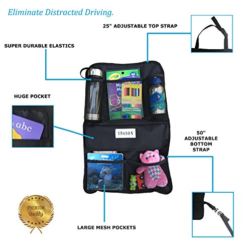 TONS OF SPACE - The organizer is large and has a ton of pockets to carry virtually anything you would take with you! Extra deep pockets with strong elastics also prevent anything from falling out, and mounts to your seat at a level that makes it easy for children to use! Works great for cars, trucks and SUVs!