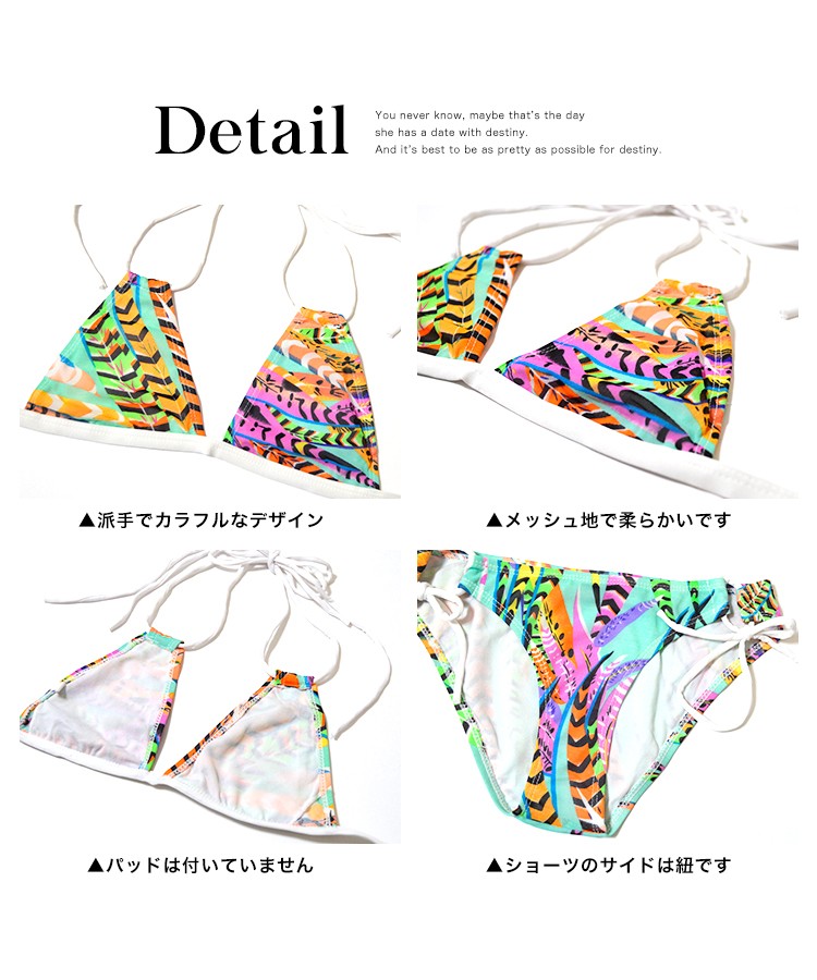 | 商品特徴 | LAVIA(ラヴィア)から新作のプチプラ水着が入荷しました。カラフルな配色がハッピーオーラ全開の三角ビキニ。パットポケットがついているのでお手持ちのお気に入りパットを入れて着用するのがオススメ!ノーワイヤーなので着心地抜群で三角ビキニ特有の女性の華奢なボディラインを演出してくれます。インポートならではの個性的な柄がとってもキュート! 【特徴】 パットなしタイプ 水着の定番と言えば三角ビキニ!アンダー、ショーツのサイドは紐タイプになっているので自分のスタイルに合わせて着用できます。また、水中でホックが外れる心配もなく安定感のある着心地が嬉しいポイントです。ネオンカラーの配色は気分までハッピーに! |