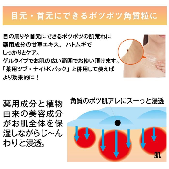 | 大ヒット商品「薬用ツブ・ナイトK」の薬用ゲルバーションが登場!!目の周囲や首元にできつポツポツの肌荒れに、薬用成分の甘草エキス、ハトムギでしっかりとケア。ゲルタイプで肌の広い範囲にお使いいただけます。 |