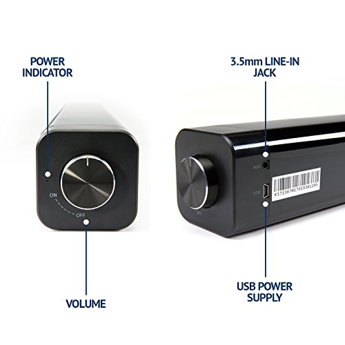 -. Feature : POWERFUL MINIATURE SOUNDBAR - Portable Speaker Projects Crystal-Clear HD Sound for Smartphone, Tablet, Home Theatre, MP3 Player & Other Music Players / SURROUND SOUND PERFORMANCE - Elongated Shape & Supercharged 10Wx2 Drivers Replace Traditional Speakers While Still Delivering Loud, Room-Filling Audio / CONVENIENT WIRELESS CONNECTION - Pair w/ Any Bluetooth-Enabled Device for Instant Entertainment; Also Comes w/ 3.5mm Line-In Jack for Wired Connection / TOUCH & REMOTE CONTROL - Simple Interface Includes Sleek Volume Control Dial & Battery Light Indicator; Skip Tracks & Change Programming Via Device / LONG-LASTING RECHARGEABLE BATTERY - Built-In Lithium Ion Battery Supports Many Hours of Play Time; Includes USB Charging Cable to Power Via Laptop, Etc.