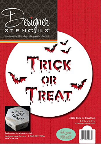 Studio : Designer Stencils Publisher : Designer Stencils Binding : Kitchen Product Description This Trick or Treat Halloween cake top design is perfect for your Halloween cakes. The design measures 5" H x 6" W in finished size, is made of 10 mil plastic for high-quality, professional, repeat use. 0
