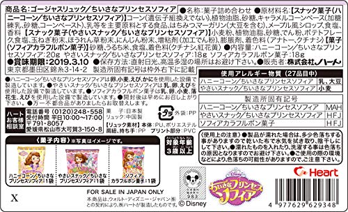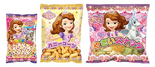 原材料:【スナック菓子(ハニーコーン/ちいさなプリンセスソフィア)】 コーン(遺伝子組換えでない)、植物油脂、砂糖、キャラメルコーンベース(加糖練乳、砂糖、コーンペースト)、乳等を主要原料とする食品、はちみつ、マーガリン(大豆を含む)、メープル風シロップ、食塩、香料【スナック菓子(やさいスナック/ちいさなプリンセスソフィア)】小麦粉、植物油脂、砂糖、でん粉、ポテトフレーク、食塩、玉ねぎ粉末、ほうれん草粉末、にんじん粉末、増粘剤(加工でん粉)、膨脹剤、着色料(アナトー、クチナシ)【菓子(ソフィアカラフルポン菓子)】砂糖、うるち米、食塩、着色料(クチナシ、紅花黄)