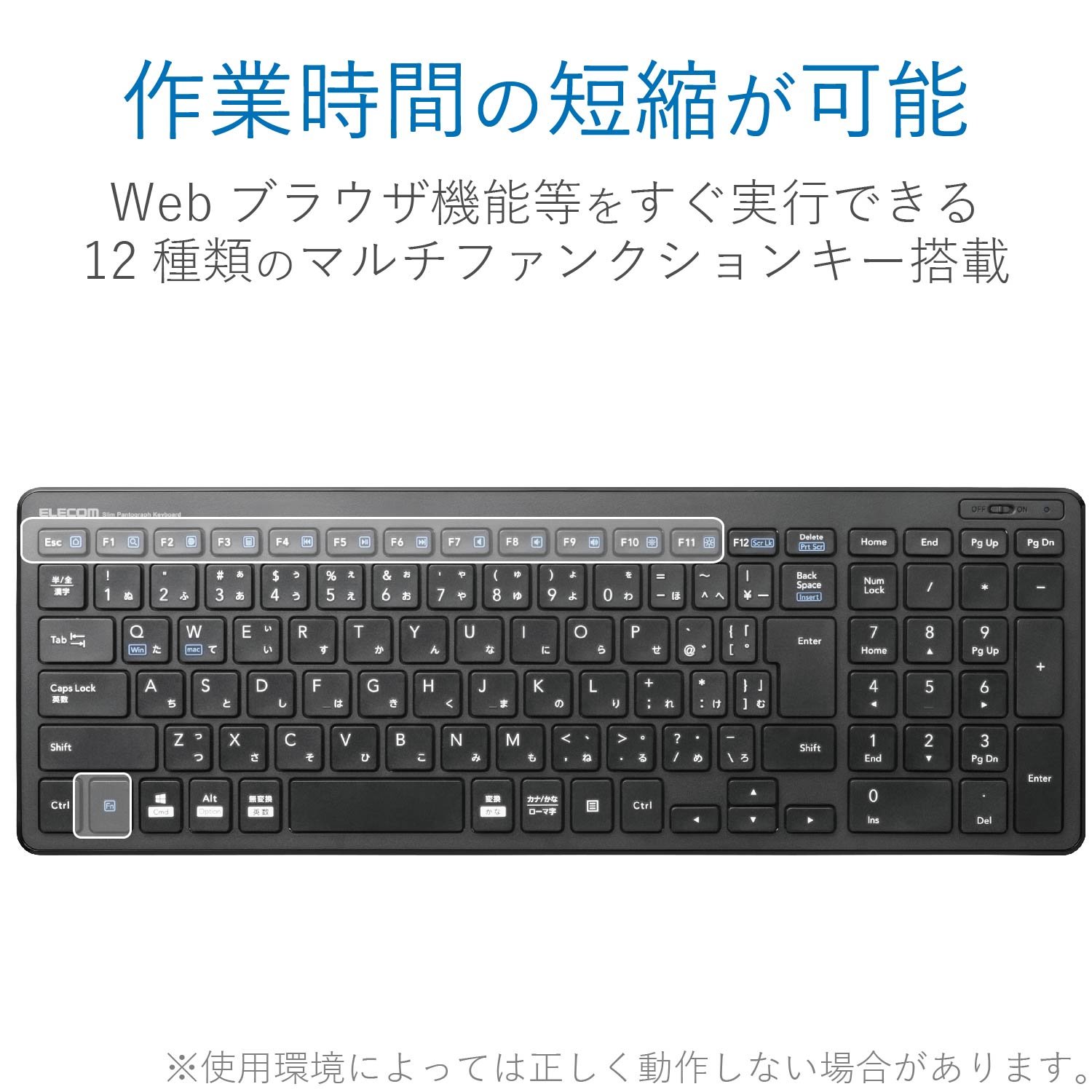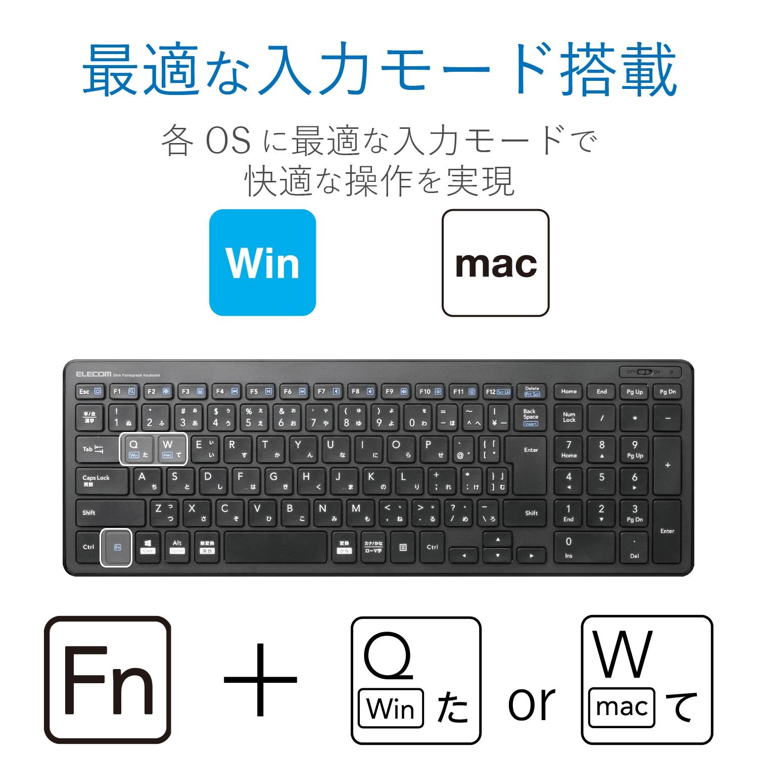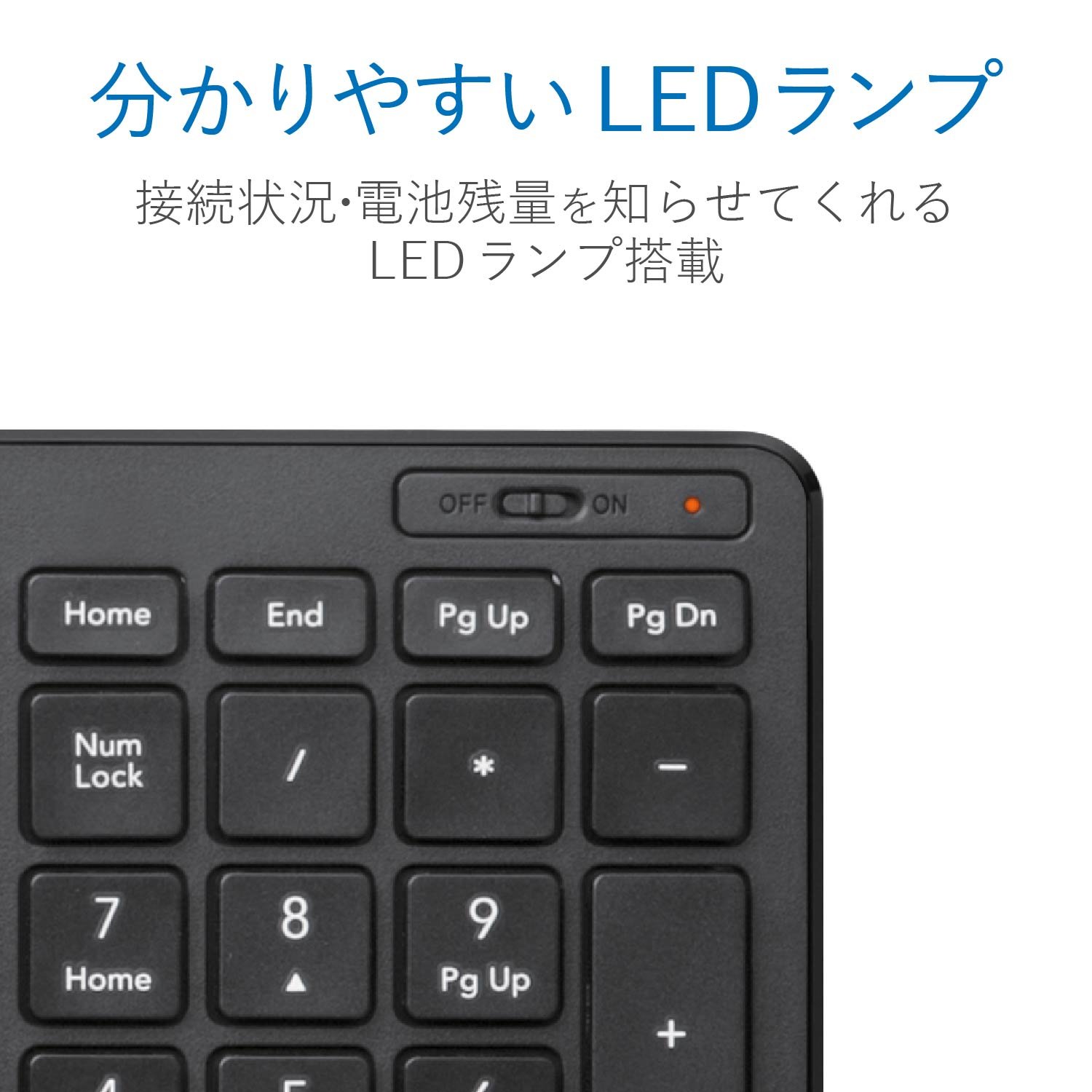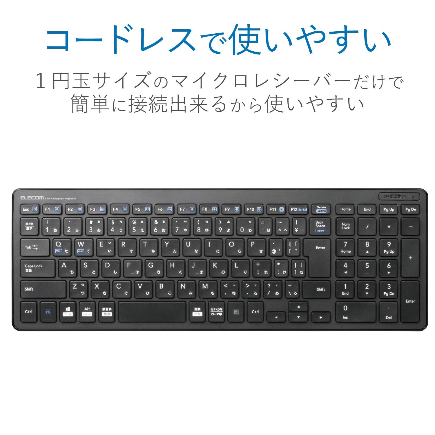 接続方式:無線(電波周波数:2.4GHz帯) 対応機種:USBポートを装備したWindows OS、Macintosh OS搭載機 キータイプ:パンタグラフ(キーストローク:2.0mm /キーピッチ:19.0mm) キー配列:104 キー(日本語配列) 電源:単4形乾電池×2 (想定電池使用期間:アルカリ乾電池使用時の目安 約1.1年 ※当社テスト値) 外形寸法(キーボード本体):幅367.1mm×奥行127.5mm×高さ21.2mm 質量(キーボード本体):約488g ※電池を含まず